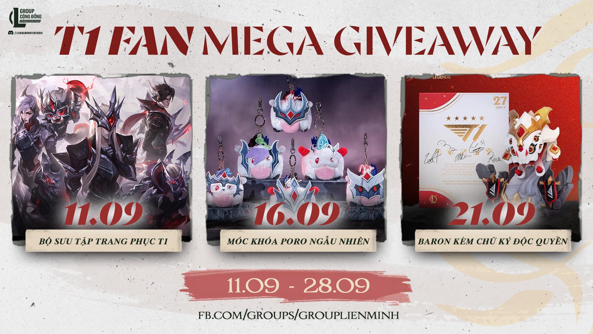 Từ 11/09 - 28/09/2025, cộng đồng fan LMHT đặc biệt là fan T1 đang bước vào những ngày cực kỳ sôi động khi sự kiện MEGA GIVEAWAY đã chính thức khởi động. Đây là dịp để anh em vừa tiếp lửa cho T1, vừa có cơ hội “ẵm” về những phần quà độc quyền cực chất! Chi tiết như sau: