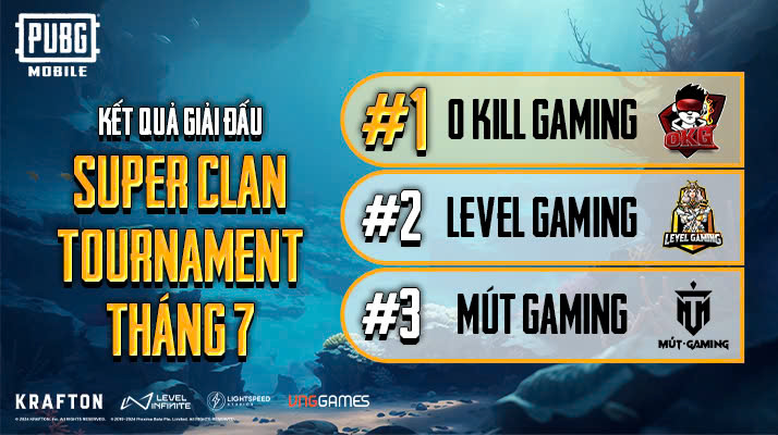 Xin chúc mừng 0 KILL GAMING clan đã xuất sắc giành chiến thắng trong cuộc đua ngôi vô địch Super Clan Tournament tháng 7. Các vị trí tiếp theo đã thuộc về Top 2: LEVEL GAMING và Top 3: MÚT GAMING.