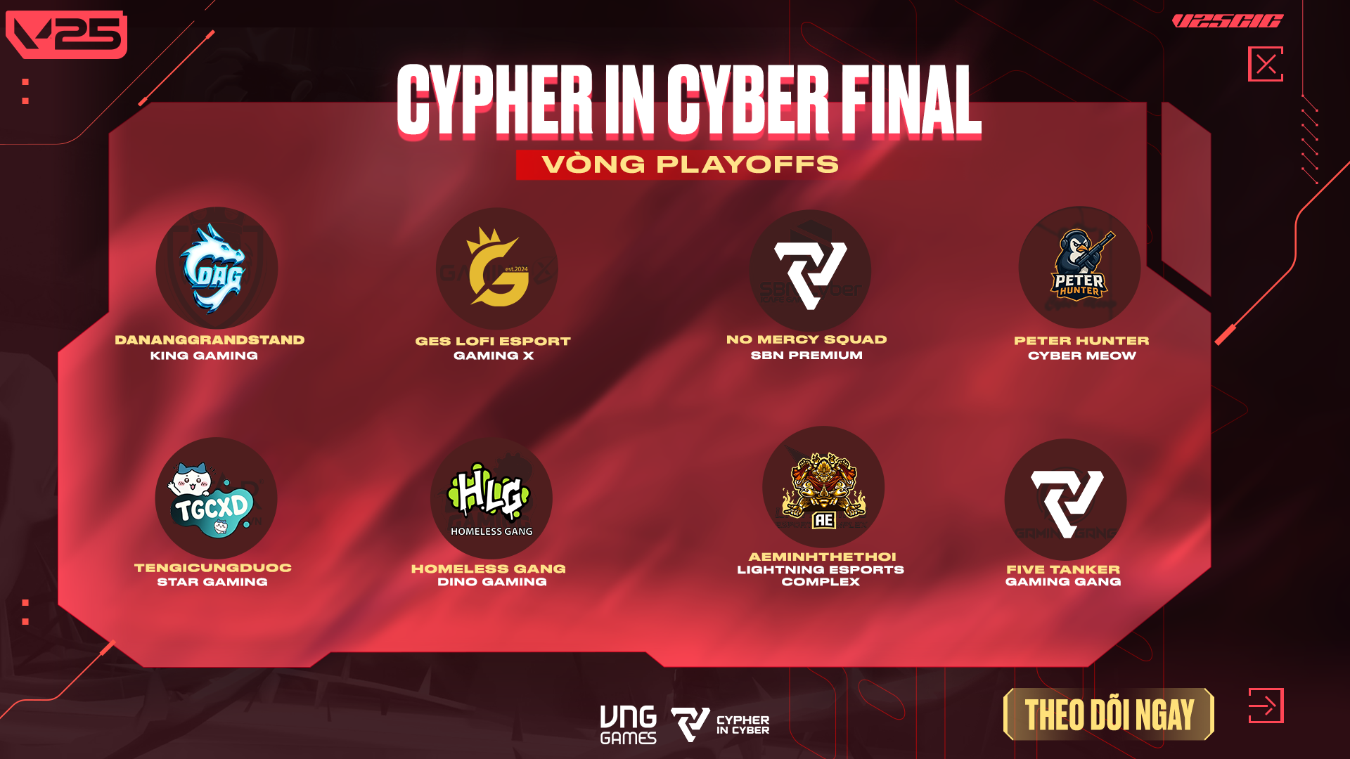 Chỉ còn 1 ngày nữa, vòng Playoffs cực kỳ hấp dẫn của giải đấu Cypher in Cyber Final #1 sẽ chính thức khởi tranh! 8 đội tuyển xuất sắc nhất hệ thống đã sẵn sàng bước vào trận chiến cuối cùng, tranh ngôi vô địch và khẳng định vị thế trên bản đồ VALORANT Việt Nam. Chi tiết như sau: