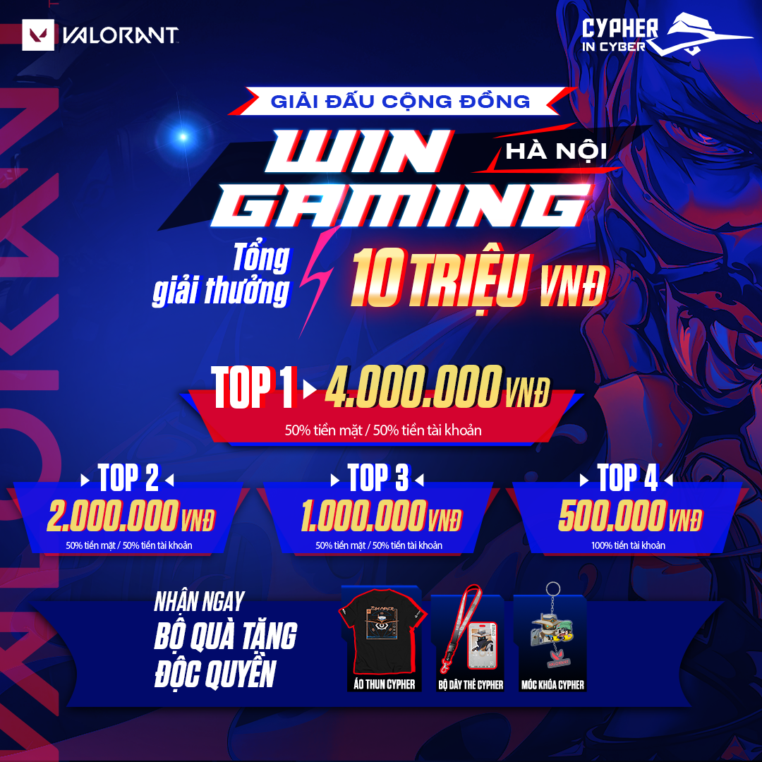 Tổng giá trị thưởng lên đến "chục củ" từ giải đấu VALORANT Cypher In Cyber x Win Gaming, kèm theo đó là rất nhiều quà tặng từ NPH VNGGames. Chi tiết như sau:
