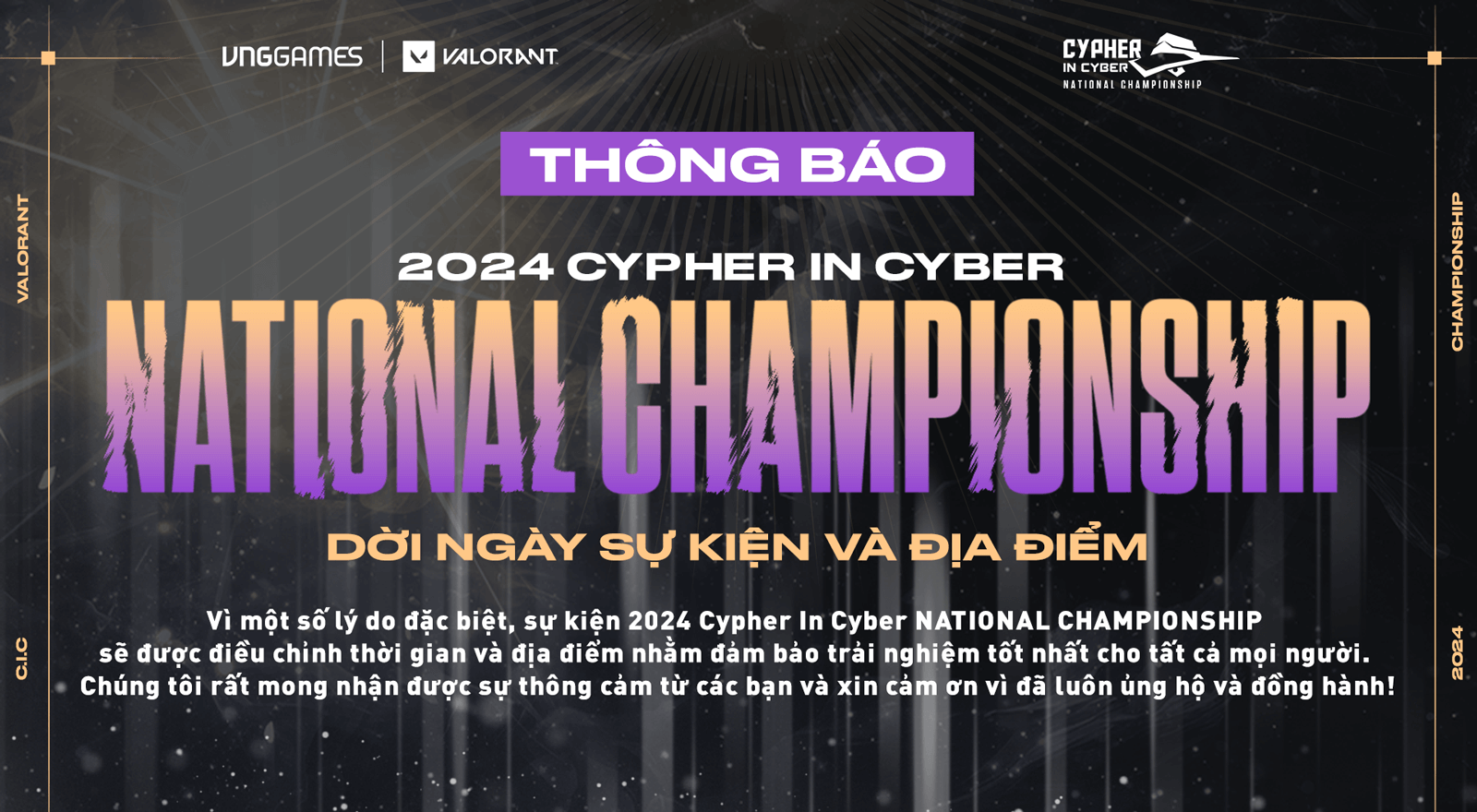 Vì một số lý do đặc biệt, sự kiện 2024 Cypher In Cyber NATIONAL CHAMPIONSHIP sẽ được điều chỉnh thời gian và địa điểm nhằm mang lại trải nghiệm tốt nhất cho tất cả người tham dự. Chi tiết như sau: