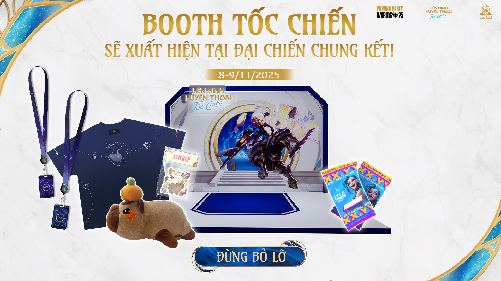 Liên Minh Huyền Thoại: Tốc Chiến chính thức góp mặt tại sự kiện VPBank presents T1 in Vietnam: The Promise Fulfilled với khu vực booth trải nghiệm riêng biệt, mang đến chuỗi hoạt động tương tác, mini game, và hàng loạt quà tặng độc quyền dành riêng cho cộng đồng game thủ Tốc Chiến và fan hâm mộ T1 tại Việt Nam. Chi tiết như sau: