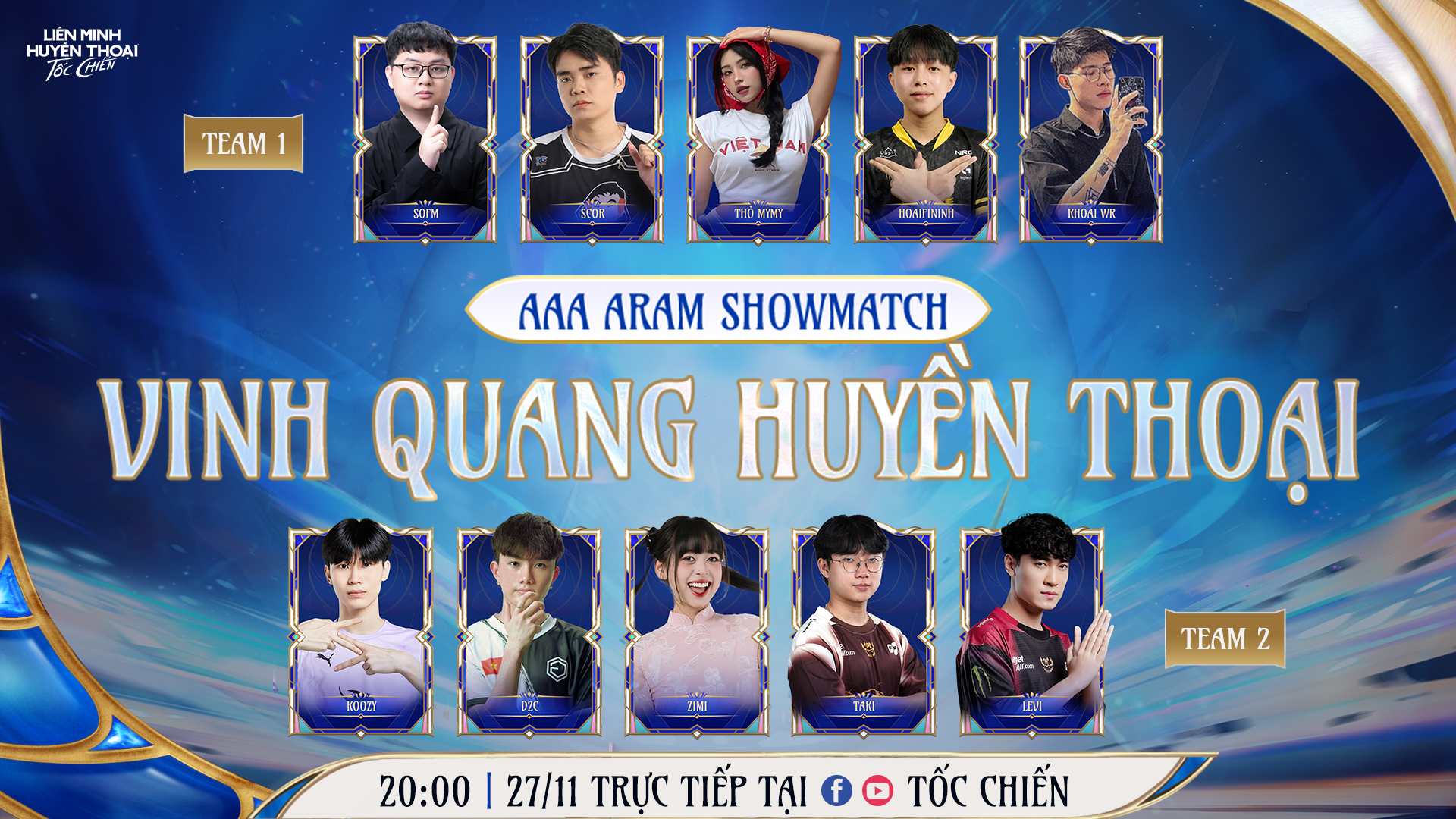 Sân khấu AAA ARAM WORLDS COLLABS sắp chính thức bùng nổ với trận Showmatch: Vinh Quang Huyền Thoại – nơi quy tụ dàn tuyển thủ và streamer tên tuổi của làng LMHT: Tốc Chiến Việt Nam. Hai đội hình tham gia đã chính thức được công bố, hứa hẹn mang đến những pha giao tranh nảy lửa và những khoảnh khắc giải trí không thể rời mắt. Chi tiết như sau: