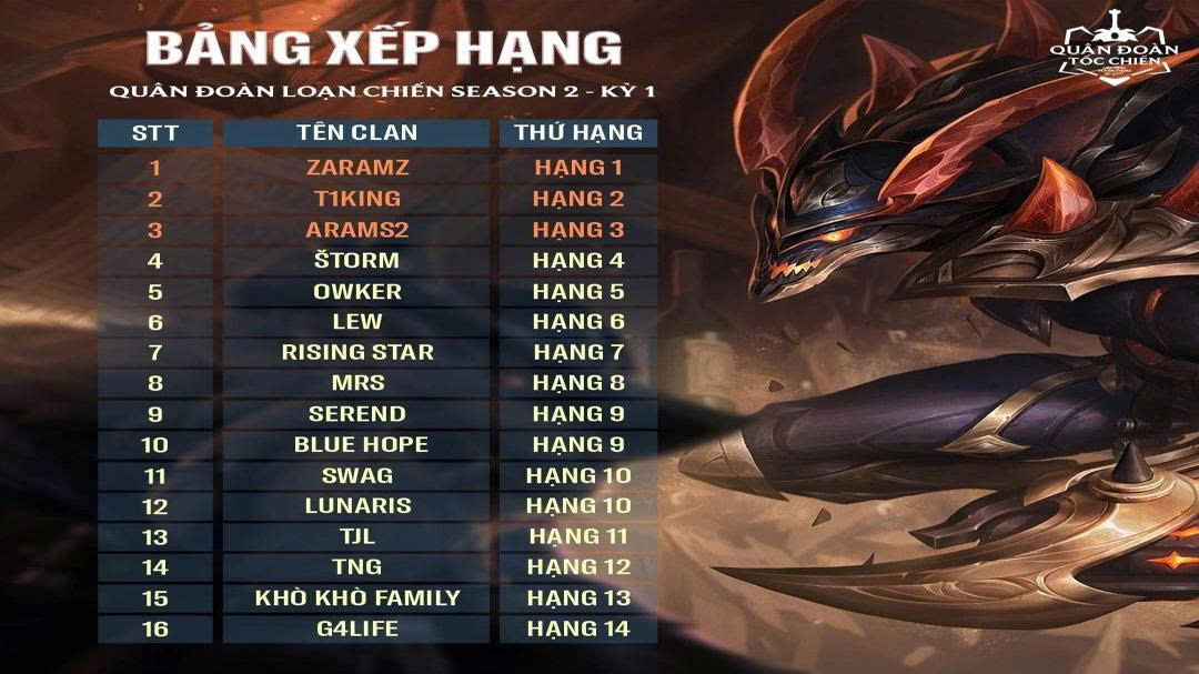 BXH Quân Đoàn Tốc Chiến Season 2 – Kỳ 1 đã khép lại với những trận combat nghẹt thở, vinh danh top các clan và chiến binh xuất sắc như ZARAMZ, T1KING, ARAMS2 và hàng loạt cái tên nổi bật. Cùng chờ đón kỳ tiếp theo với nhiều bất ngờ và cơ hội bứt phá!. Chi tiết như sau: