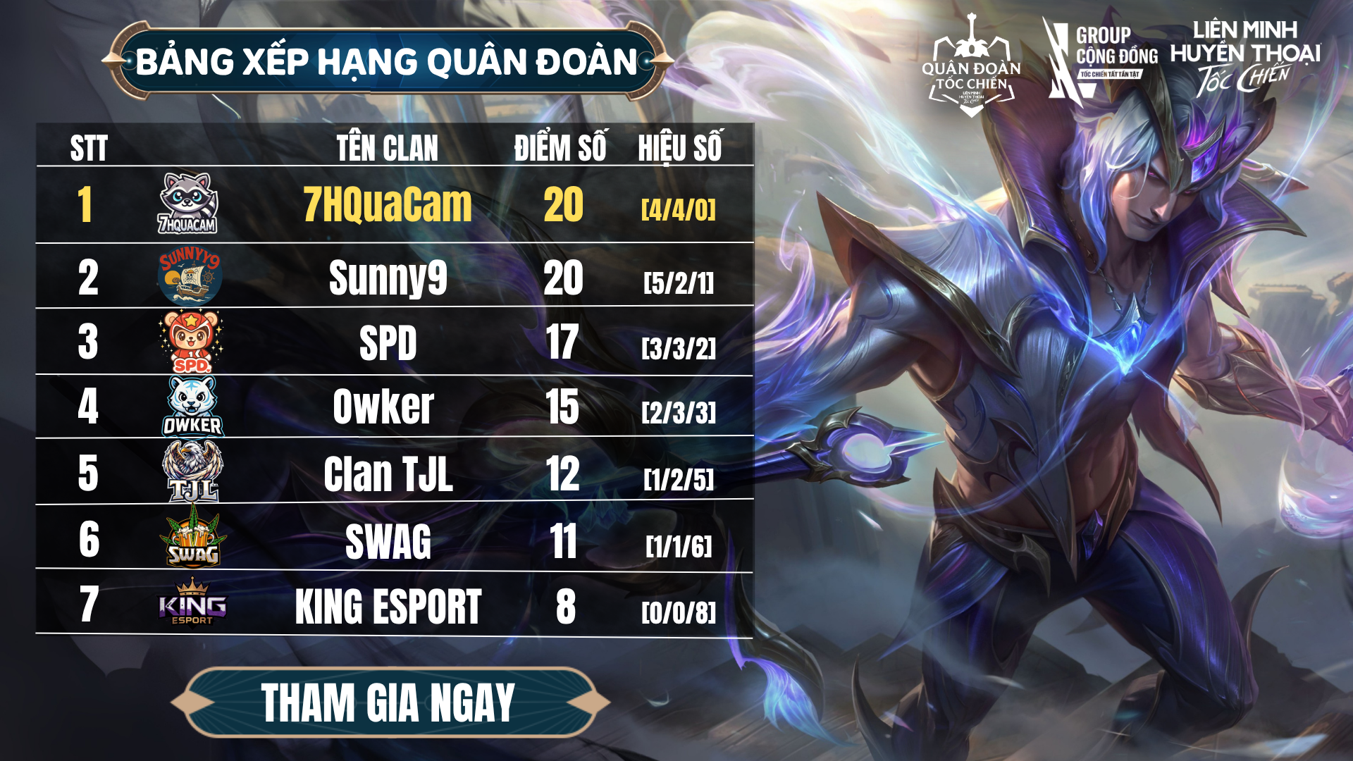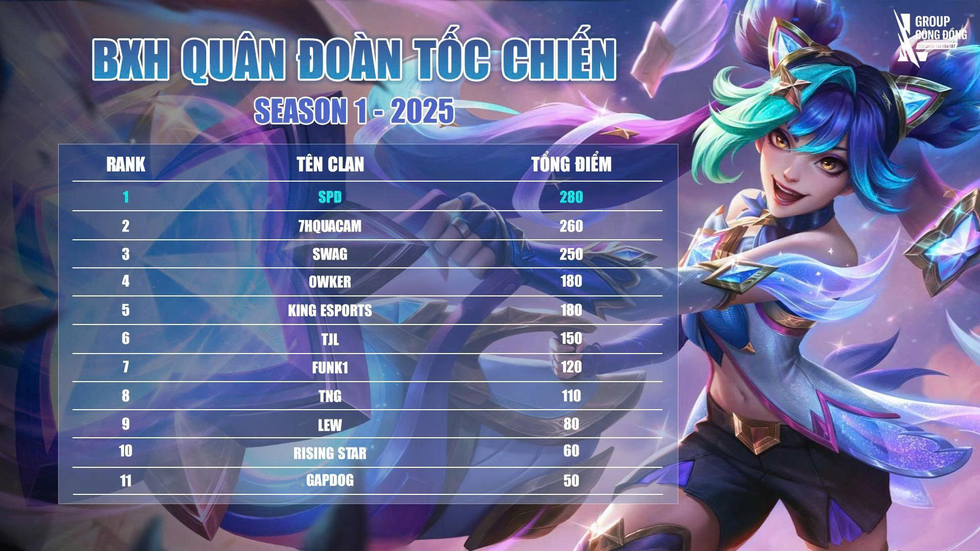 Sau những vòng đấu căng thẳng và nghẹt thở, bảng xếp hạng Quân Đoàn Tốc Chiến đã chính thức được cập nhật. Cục diện đang cực kỳ hấp dẫn khi 7Hquacam và Sunny9 đang song hành ở ngôi đầu với 20 điểm – chỉ chênh nhau hiệu số mong manh! Chi tiết như sau: