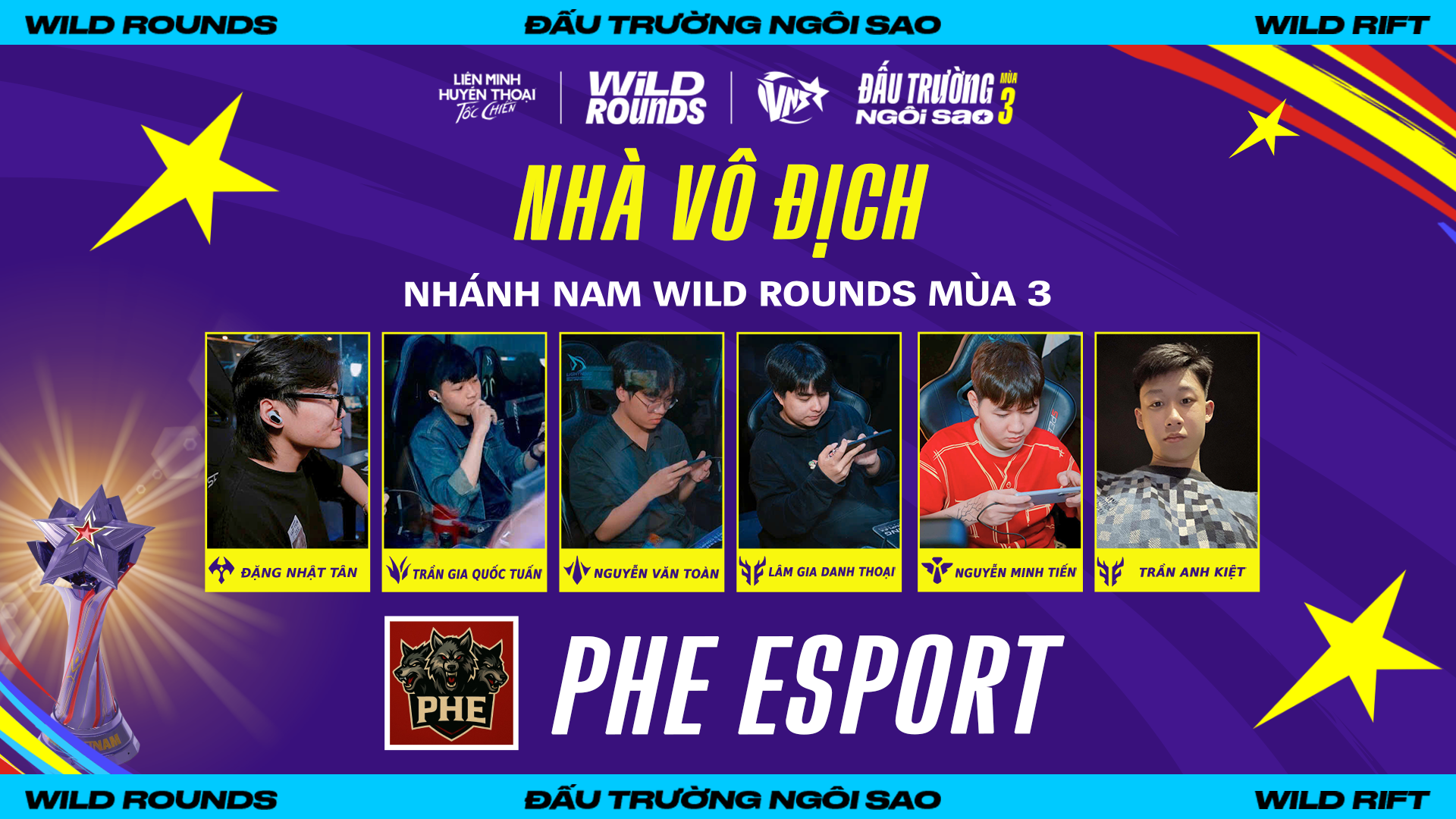 Sau hành trình tranh tài gay cấn và đầy kịch tính, đội tuyển PHE Esport đã chính thức đăng quang ngôi vô địch nhánh Nam cộng đồng tại Wild Rounds: Đấu Trường Ngôi Sao mùa 3 – giải đấu quy mô toàn quốc do Tốc Chiến Việt Nam tổ chức, nhằm tạo sân chơi chuyên nghiệp và tăng cường sự gắn kết trong cộng đồng game thủ. Chi tiết như sau: