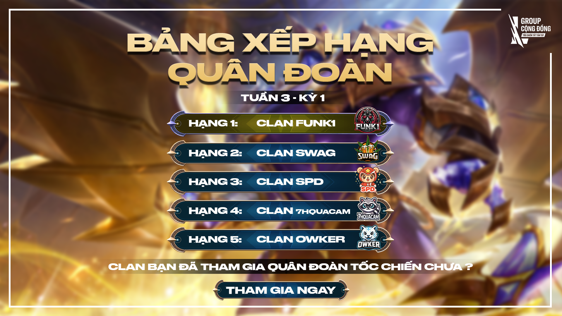 Sau nhiều trận đấu đầy kịch tính và gay cấn, bảng xếp hạng Quân Đoàn Tốc Chiến tháng 6 - 7 đã chính thức lộ diện! Những cái tên quen thuộc tiếp tục khẳng định sức mạnh, trong khi một vài “tân binh” cũng đang bứt phá mạnh mẽ. Cùng điểm qua thứ hạng các Clan xuất sắc nhất tháng vừa qua. Chi tiết như sau: