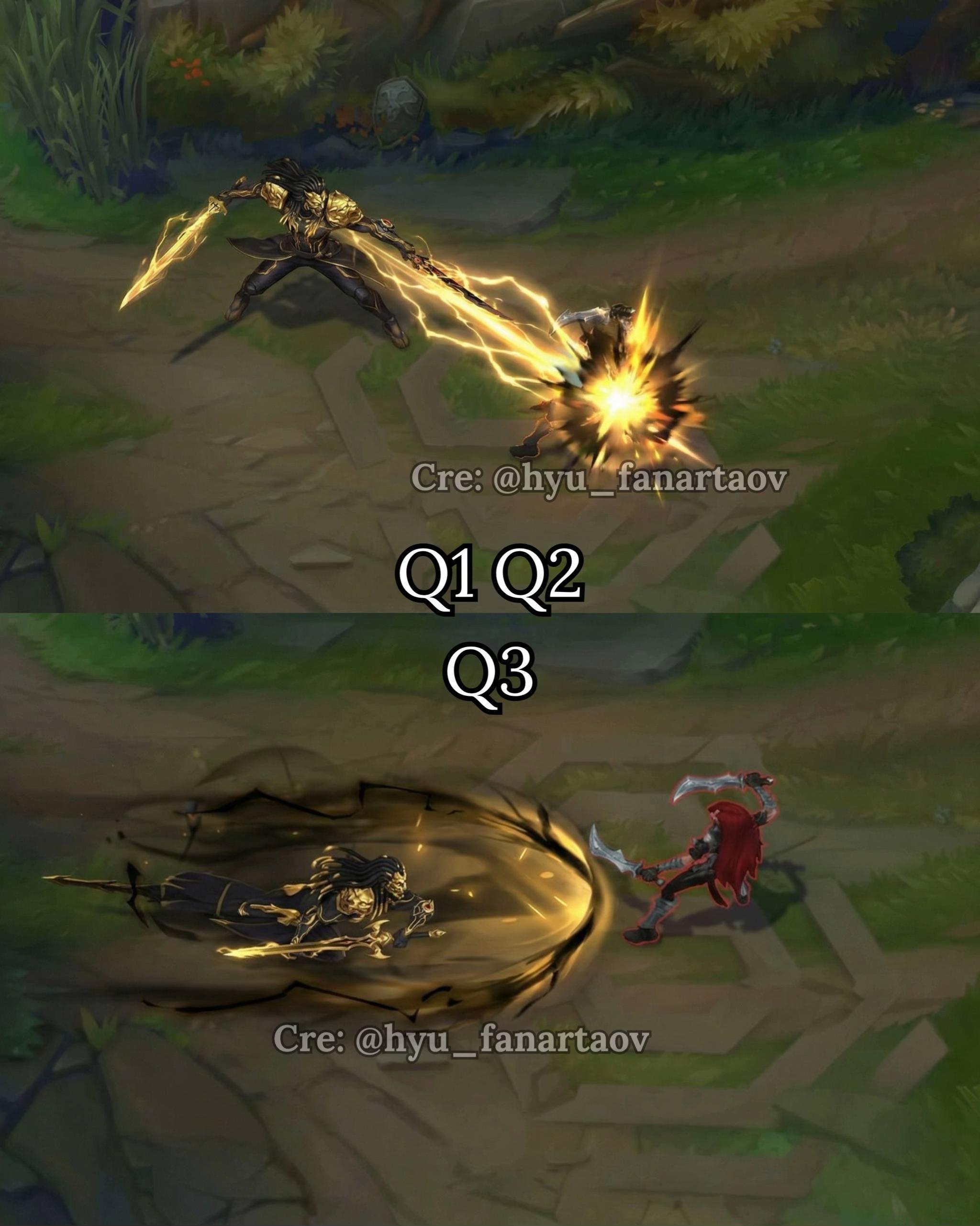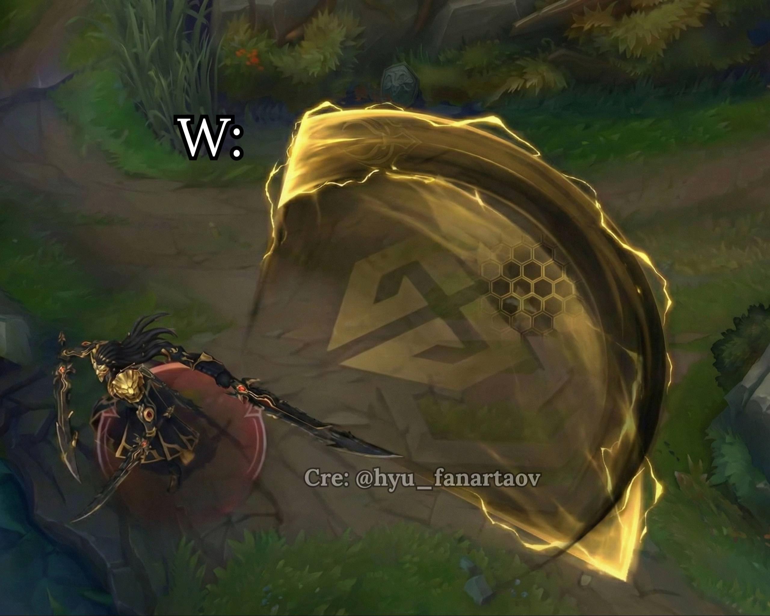 Ở lần tung chiêu thứ ba (Q3), khi Yone lướt đi kèm lốc xoáy, dưới chân xuất hiện sóng xung kích tông vàng - đen lan tỏa, trông cực kỳ quyền lực.