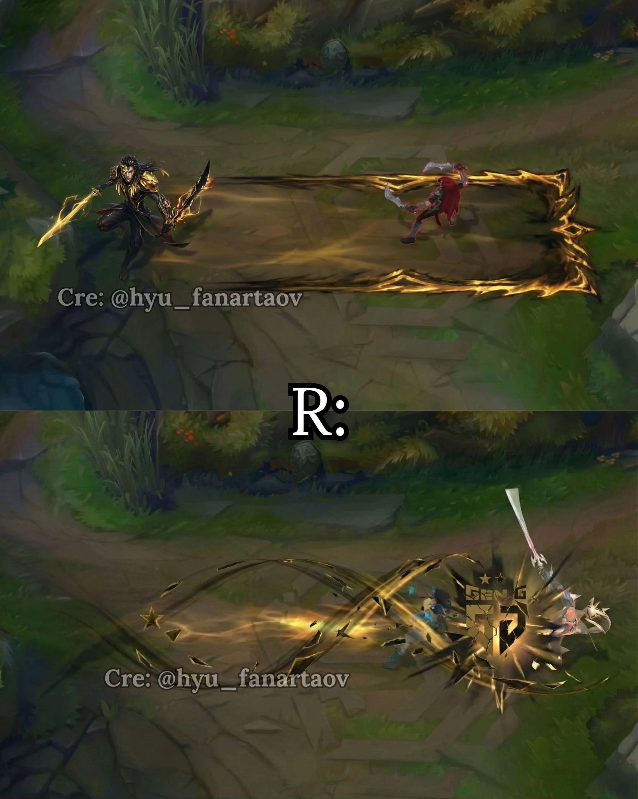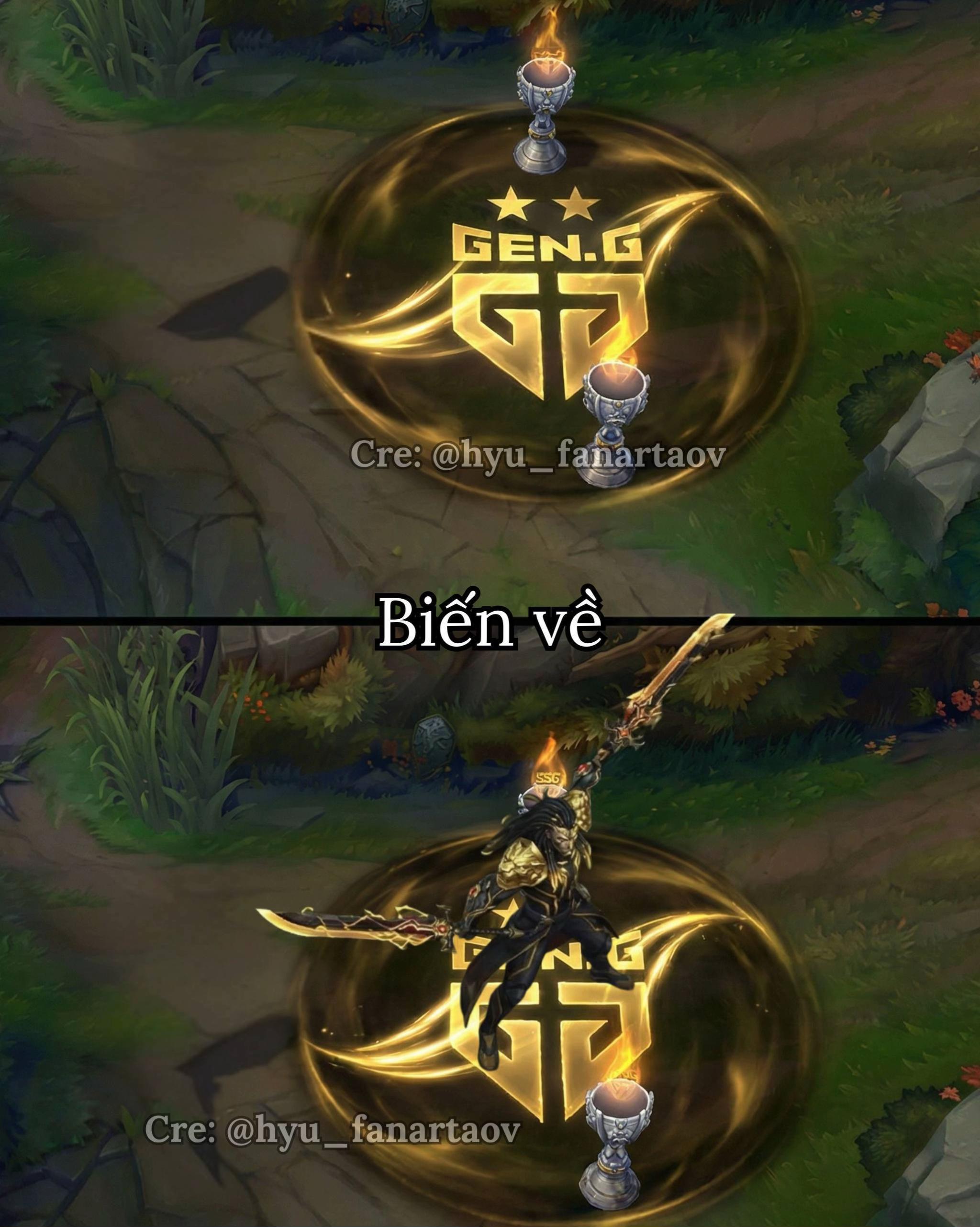 Theo đó, đây là sản phẩm fan-art do creator @hyu_fanartaov thực hiện, với sự hỗ trợ của công nghệ AI, tái hiện viễn cảnh nếu Gen.G có cơ hội bước lên ngôi vô địch tại CKTG.