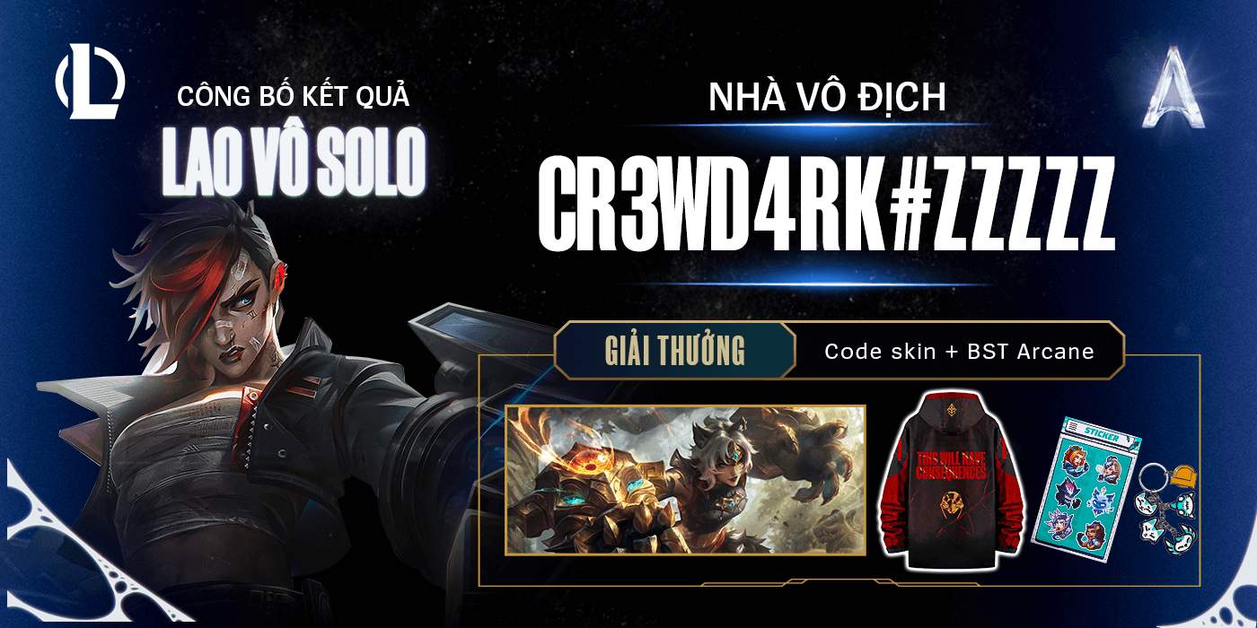 🏆 Với kỹ năng siêu việt và bản lĩnh kiên định, tuyển thủ Cr3wD4rk#zzzzz đã đăng quang ngôi vị số một, khẳng định sức mạnh không thể xem thường. Hãy cùng hòa chung niềm vui khi người chiến thắng mang về cho mình chiếc áo khoác Arcane 2024 đầy kiêu hãnh!