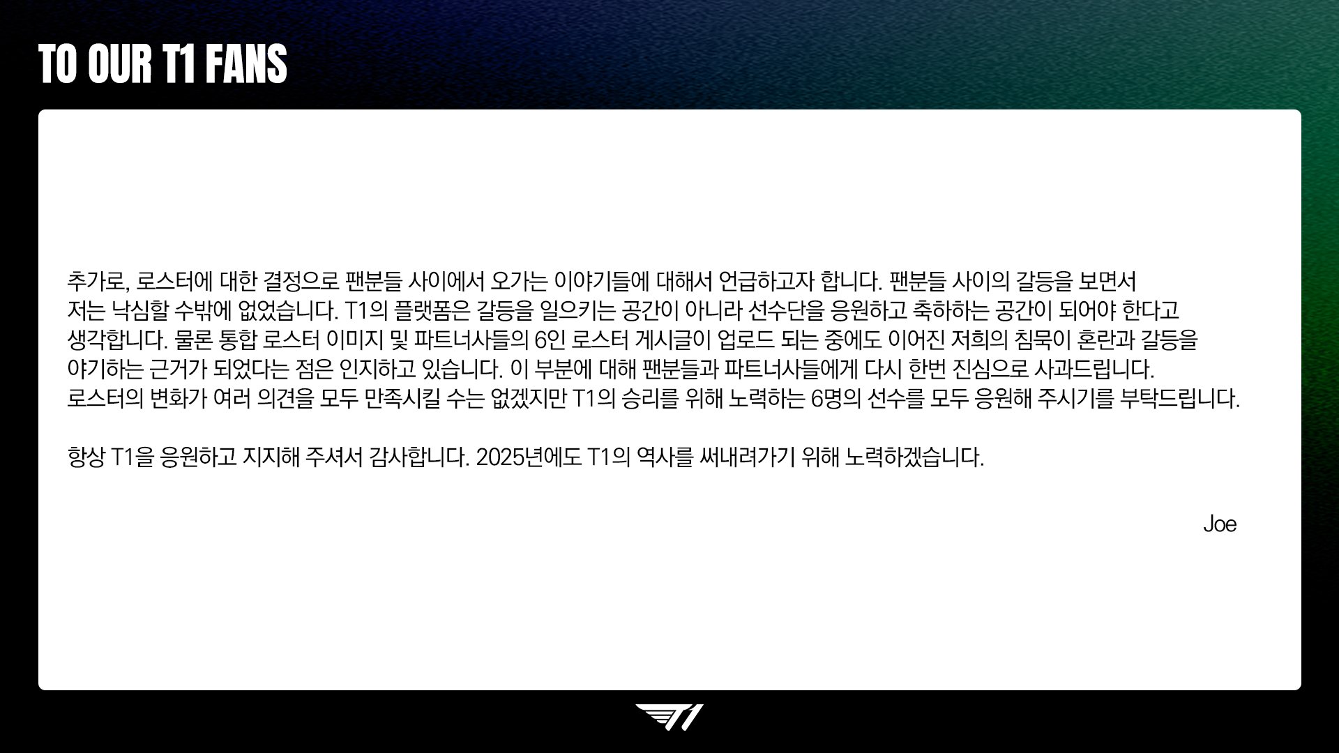 - Tôi cũng muốn nói về những tranh luận trong cộng đồng người hâm mộ xoay quanh quyết định đội hình. Thật đáng buồn khi thấy sự chia rẽ trong cộng đồng của chúng ta. Các nền tảng của T1 nên là nơi tôn vinh tất cả tuyển thủ của chúng ta, chứ không phải tạo ra mâu thuẫn. Tôi nhận thức được rằng sự im lặng của chúng tôi, cùng với một số sai sót trong việc công bố hình ảnh đội hình và cam kết với nhà tài trợ, đã gây ra sự nhầm lẫn. Vì điều đó, tôi chân thành xin lỗi những người hâm mộ trung thành và các đối tác của chúng tôi. Những thay đổi trong đội hình luôn vấp phải nhiều ý kiến trái chiều, nhưng tôi mong các bạn sẽ tiếp tục ủng hộ cả sáu tuyển thủ, vì mục tiêu mang chiến thắng về cho T1.