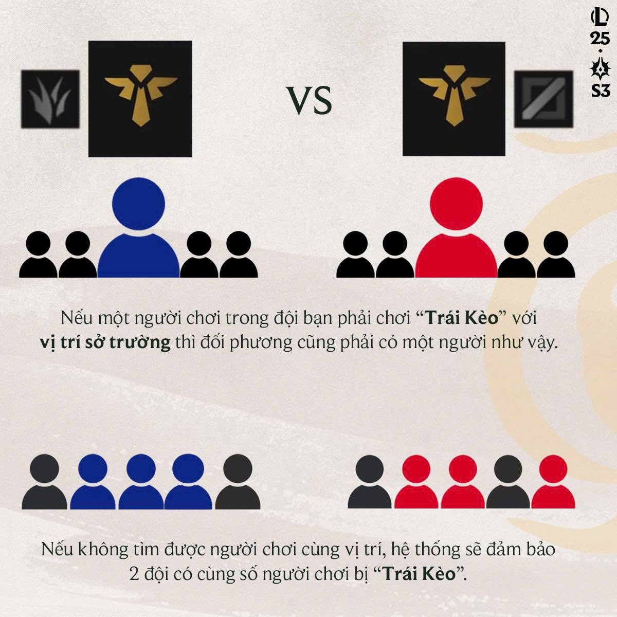 Bên cạnh việc bảo vệ quyền lợi cá nhân, hệ thống ghép đội mới còn đặc biệt chú trọng đến tính công bằng trong quá trình sắp xếp đội hình. Theo đó, nếu đội của bạn có một người chơi buộc phải đảm nhận vị trí trái kèo, đội đối phương cũng sẽ được xếp một người chơi trong hoàn cảnh tương tự.Trong những trường hợp hiếm hoi khi không thể tìm đủ người chơi cho cùng một vị trí, hệ thống sẽ đảm bảo cả hai đội có số lượng người chơi trái kèo ngang nhau, hạn chế tối đa sự chênh lệch ngay từ khâu ghép đội.