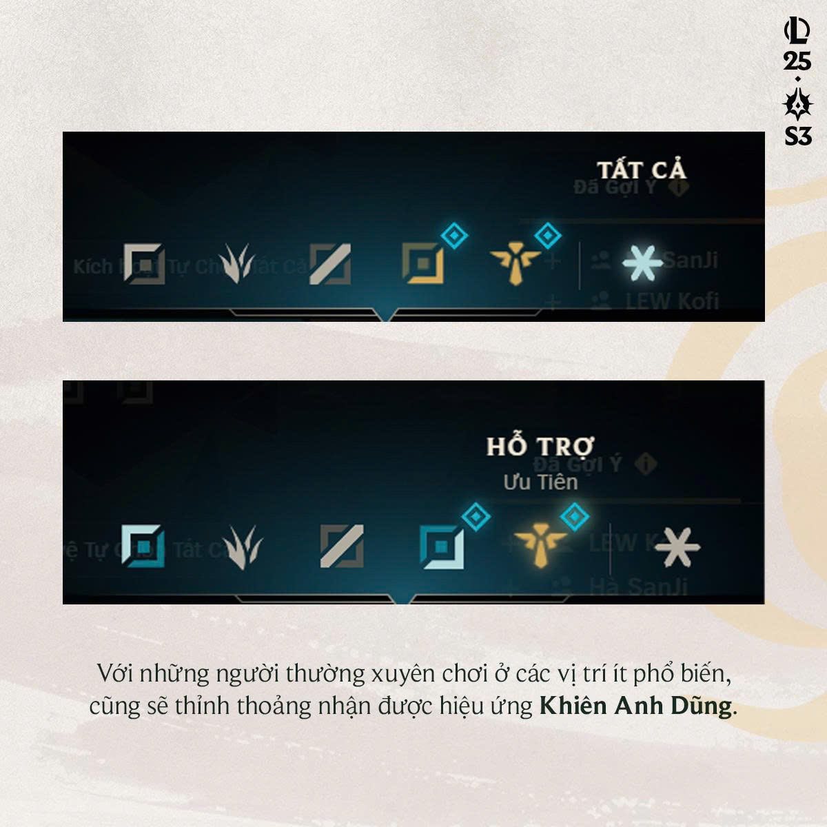 Một trong những điểm nhấn đáng chú ý nhất của hệ thống ghép đội mới là Khiên Anh Dũng – cơ chế được thiết kế dành riêng cho những người chơi buộc phải đảm nhận vai trò “trái kèo”, tức không đúng với vị trí sở trường.