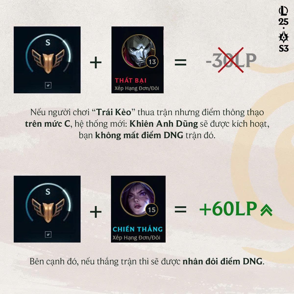 Cụ thể, nếu người chơi bị xếp vào vị trí trái kèo và không may thất bại, nhưng vẫn đạt điểm thông thạo từ mức C trở lên, họ sẽ không bị trừ điểm DNG (LP).