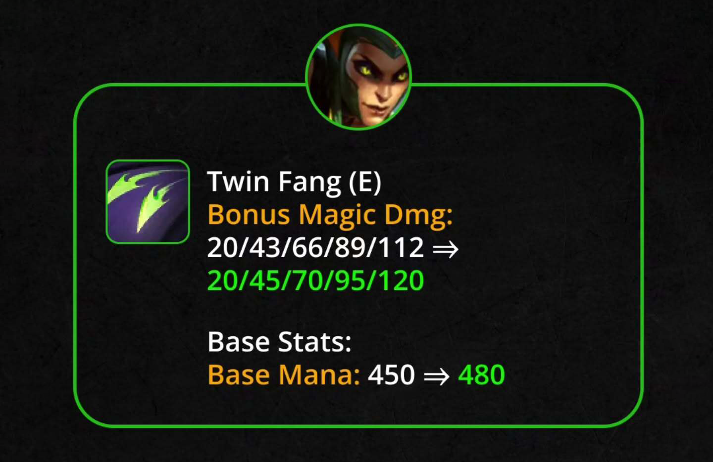 E - Nanh Độc: Sát thương phép gây thêm lên mục tiêu Trúng Độc tăng từ 20/43/66/89/112 → 20/45/70/95/120.
