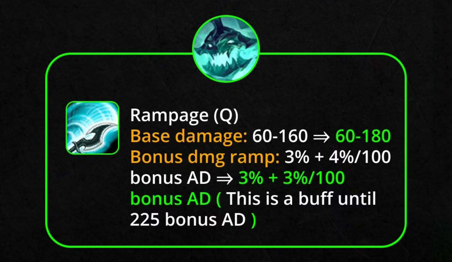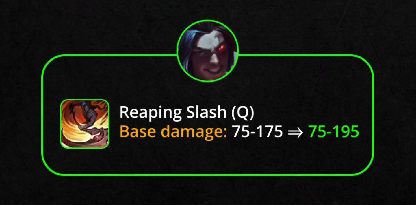 Q – Trảm: Sát thương cơ bản 75/100/125/150/175 → 75/105/135/165/195