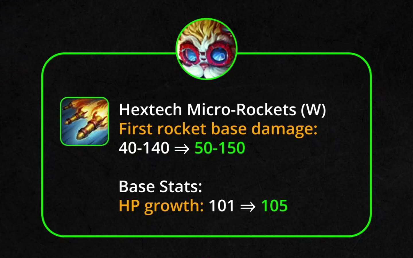 W – Tên Lửa Hextech: Sát thương tên lửa đầu tiên tăng 40/65/90/115/140 → 50/75/100/125/150