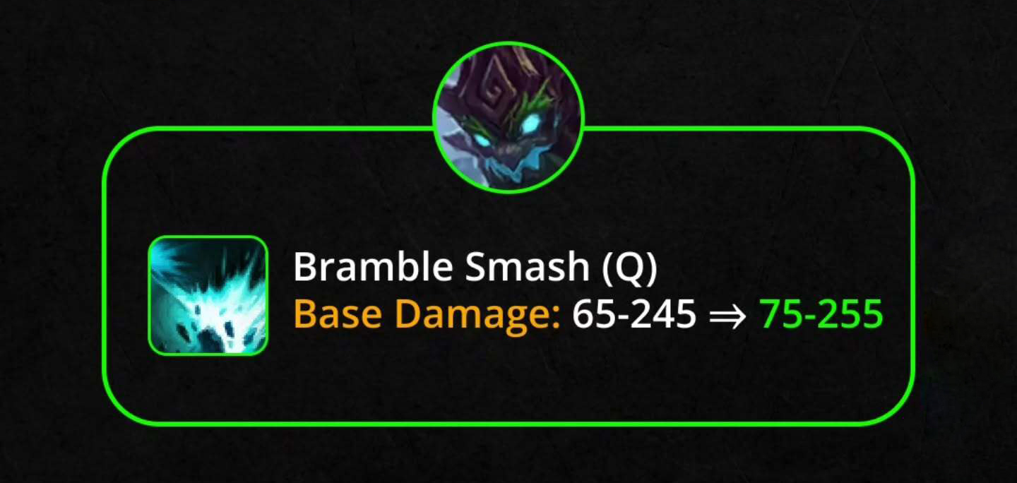 Q – Bụi Cây Công Kích: Sát thương cơ bản 65/110/155/200/245 → 75/120/165/210/255