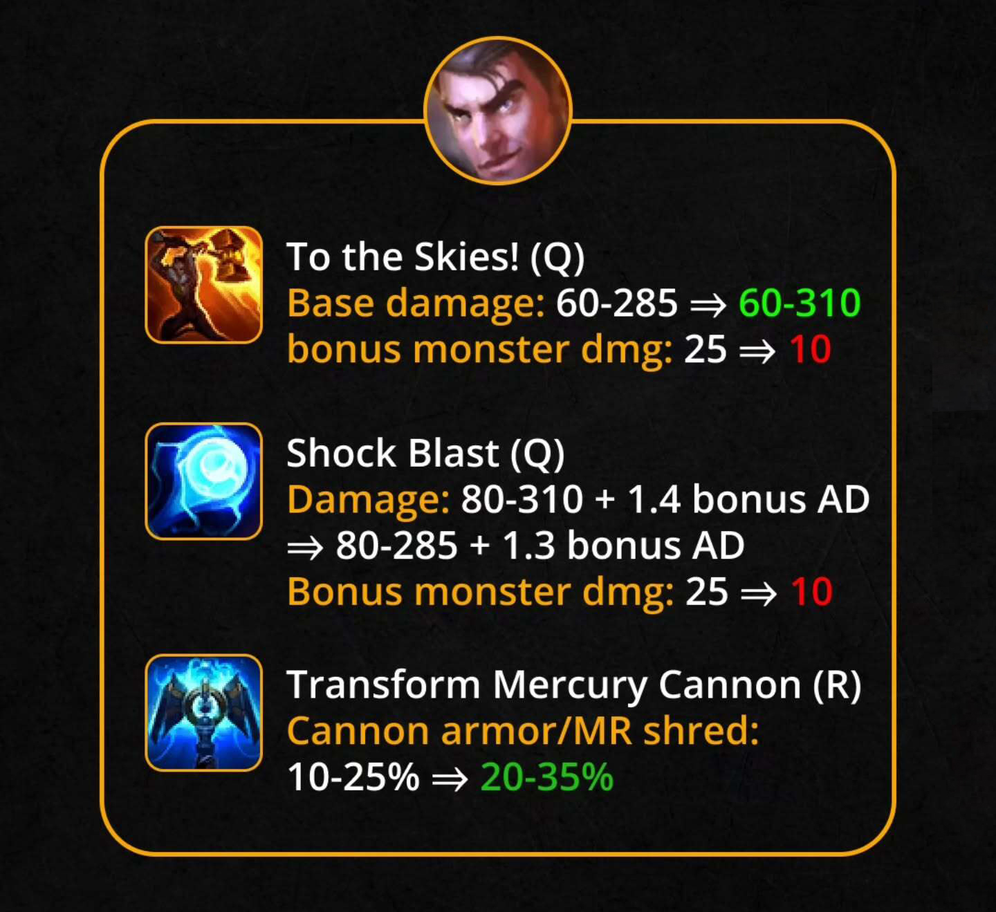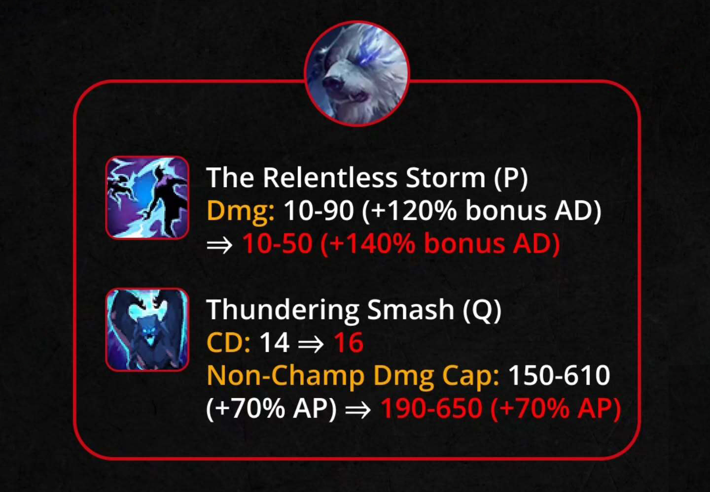 Dạng Búa (Q): Sát thương cơ bản 285 → 310.