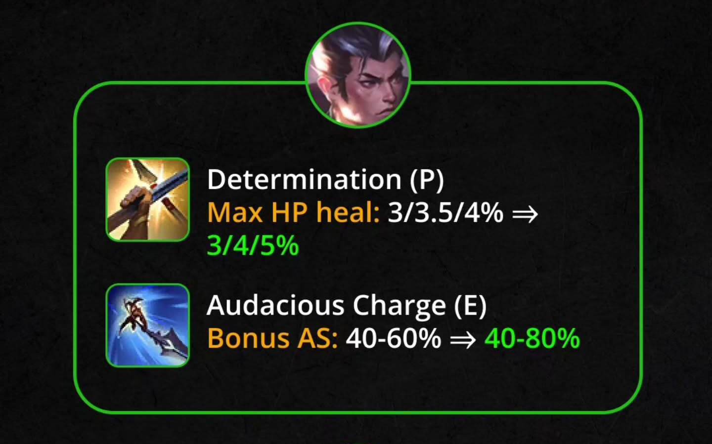 Nội tại – Quyết Đoán: Hồi máu theo % máu tối đa 3/3.5/4% → 3/4/5% (cấp 1/6/11)