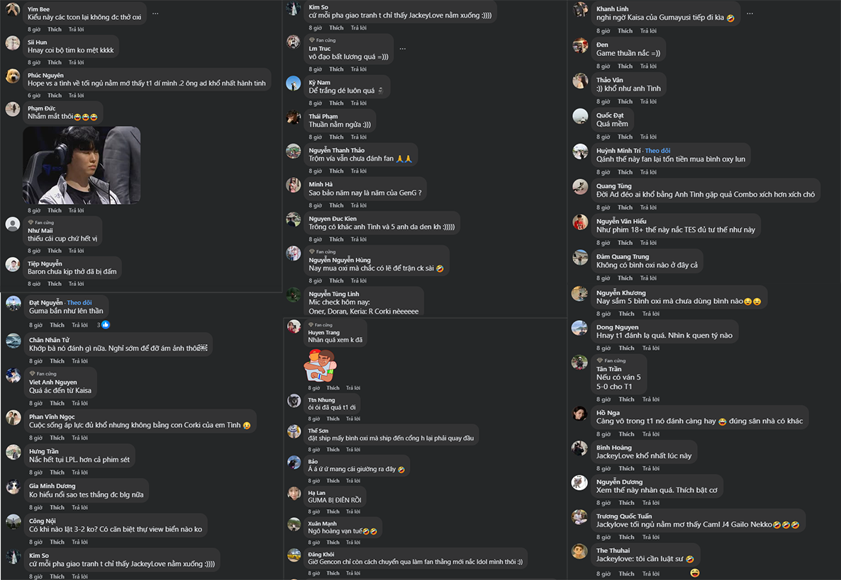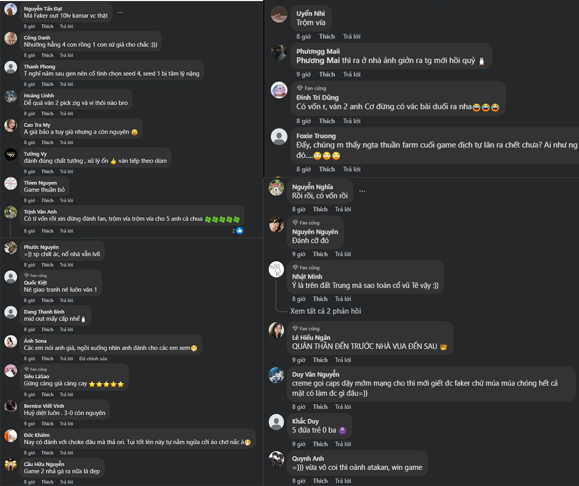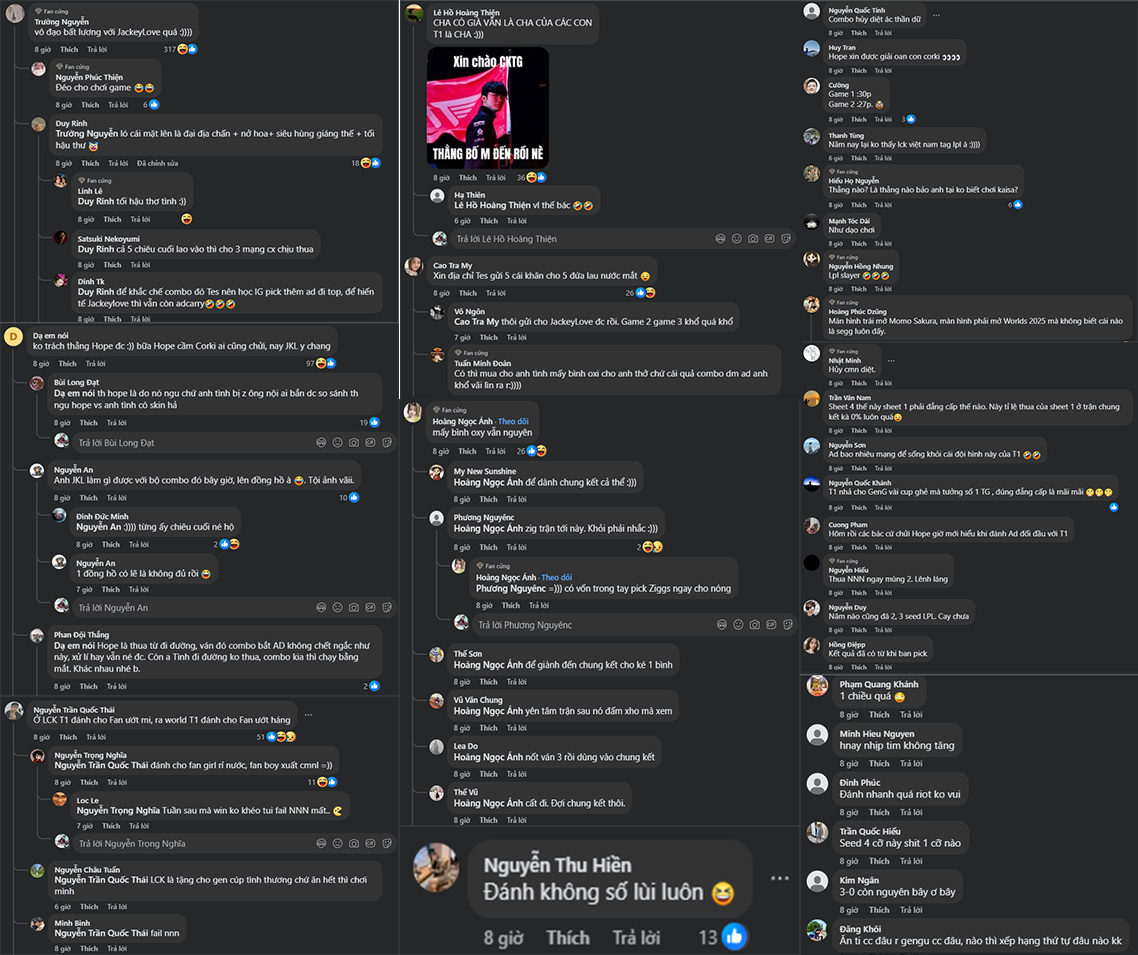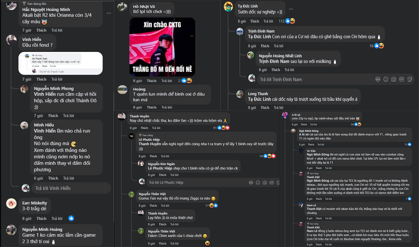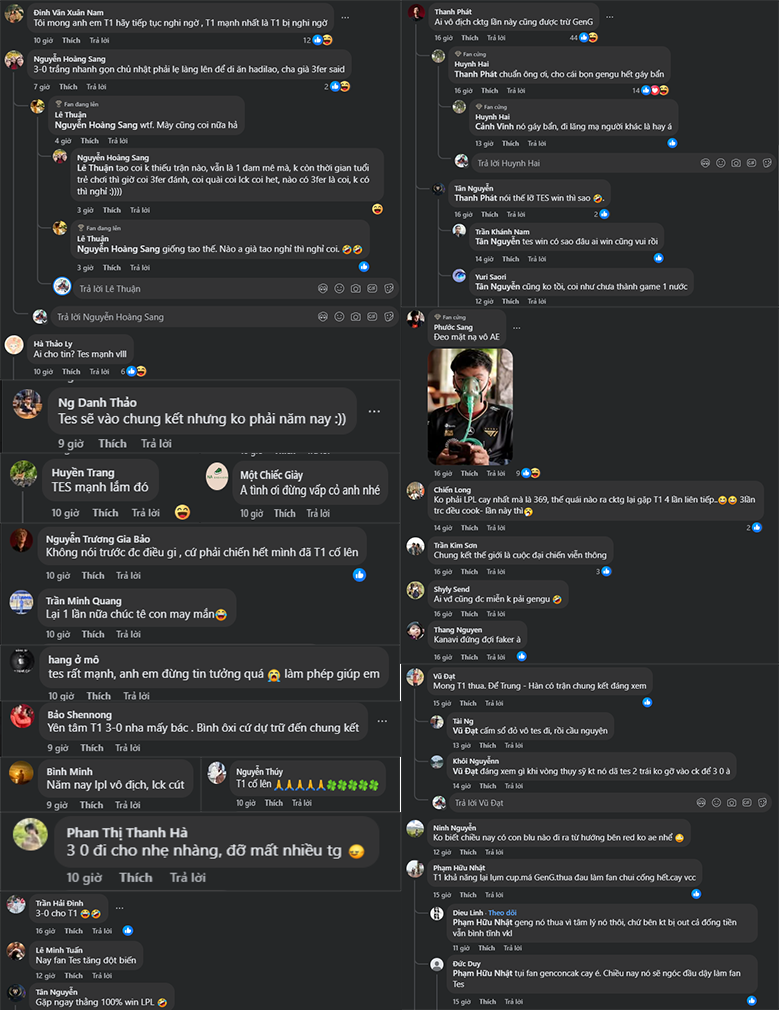 Đến game 3, T1 khép lại loạt Bo5 một cách hoàn hảo. TES cố thủ trong tuyệt vọng trước lối đánh như “đi tập LCK” của đối thủ. Fan Việt để lại hàng loạt bình luận hóm hỉnh nhưng đầy ngưỡng mộ: