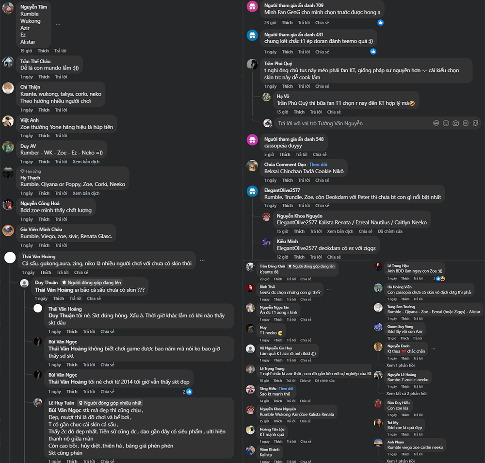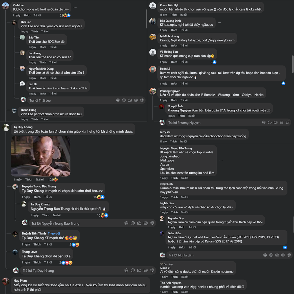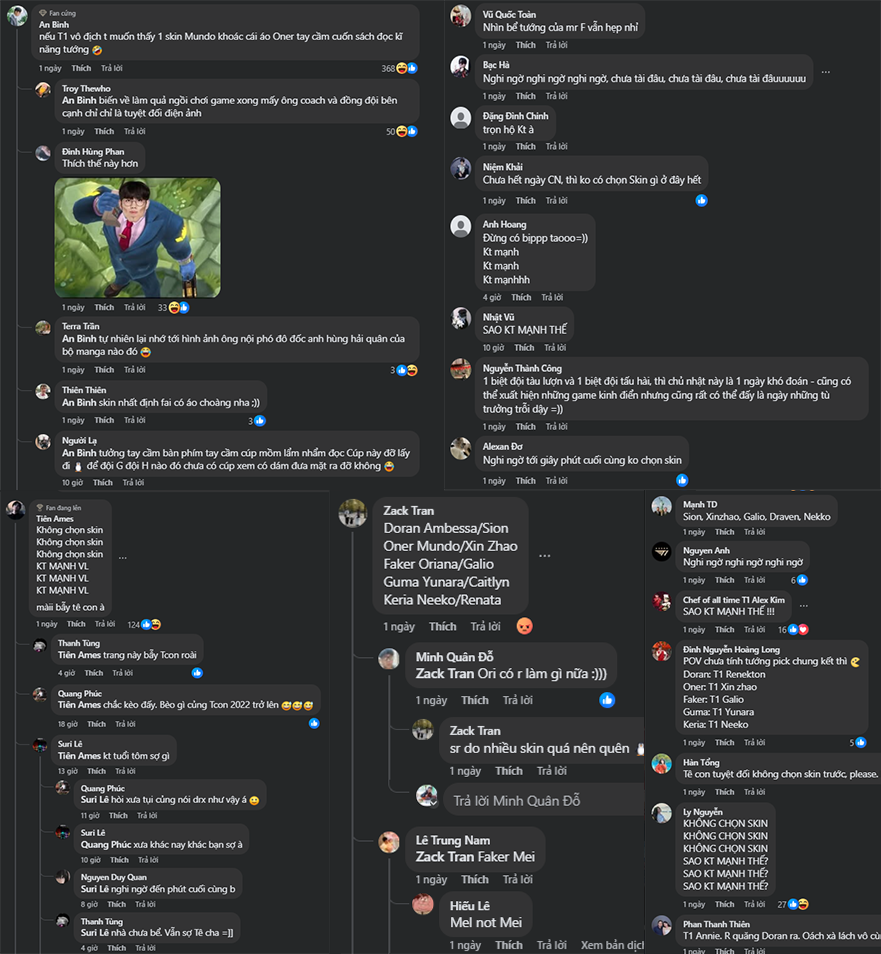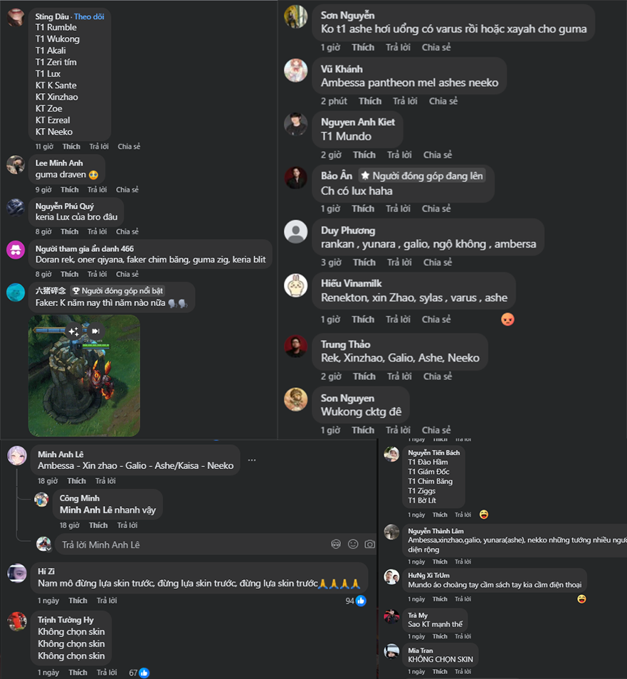 Bên cạnh những lời khấn nguyện “đừng chọn skin sớm”, các fan cũng không quên phần dự đoán cho vui – và thật bất ngờ, những dự đoán này cực kỳ sáng tạo, hài hước và đầy màu sắc cá nhân: