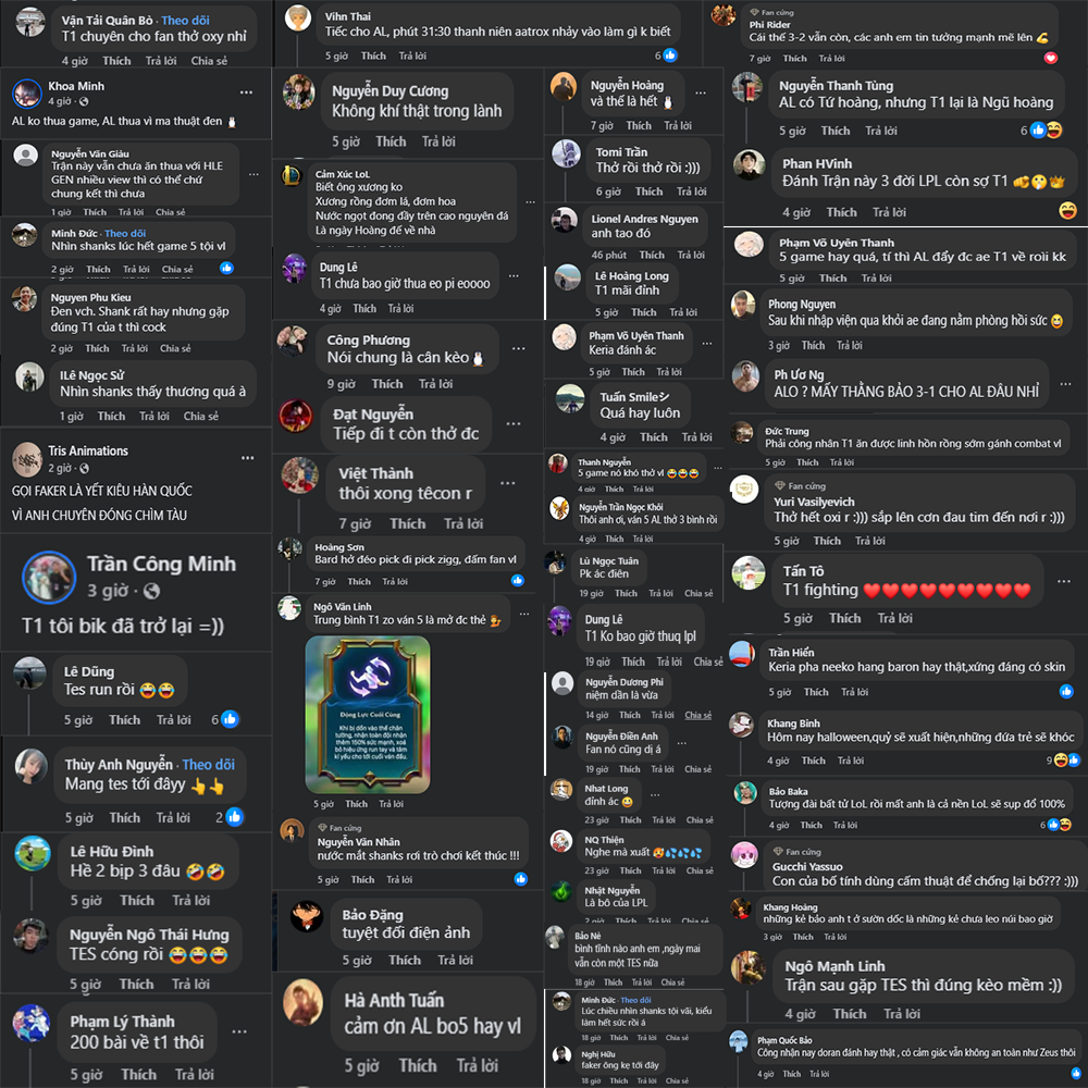 Khi trận đấu khép lại với tỷ số 3-2 nghiêng về T1, toàn bộ cộng đồng như vỡ òa trong cảm xúc. Fan T1 hạnh phúc, fan AL tiếc nuối, còn fan trung lập thì dành trọn lời khen cho cả hai đội. Những bình luận “chất như nước cất” lần lượt xuất hiện: