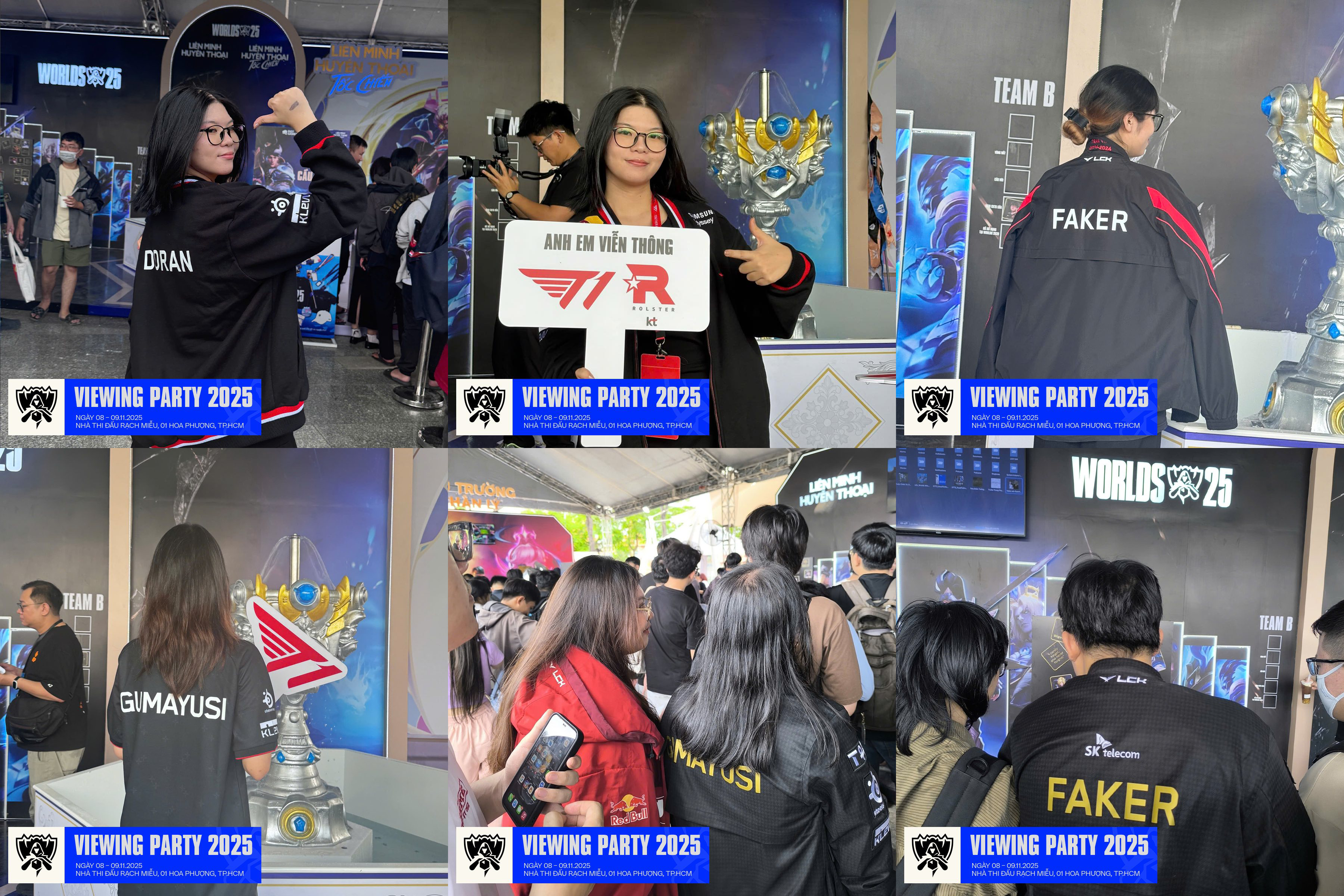 Khu vực này lúc nào cũng đông nghẹt người, không khí sôi nổi như một “phòng chờ trước trận chung kết”. Người hô “T1 vô địch!”, người tự hào khoe role KT Rolster, xen lẫn là tiếng gọi nhau rộn ràng: