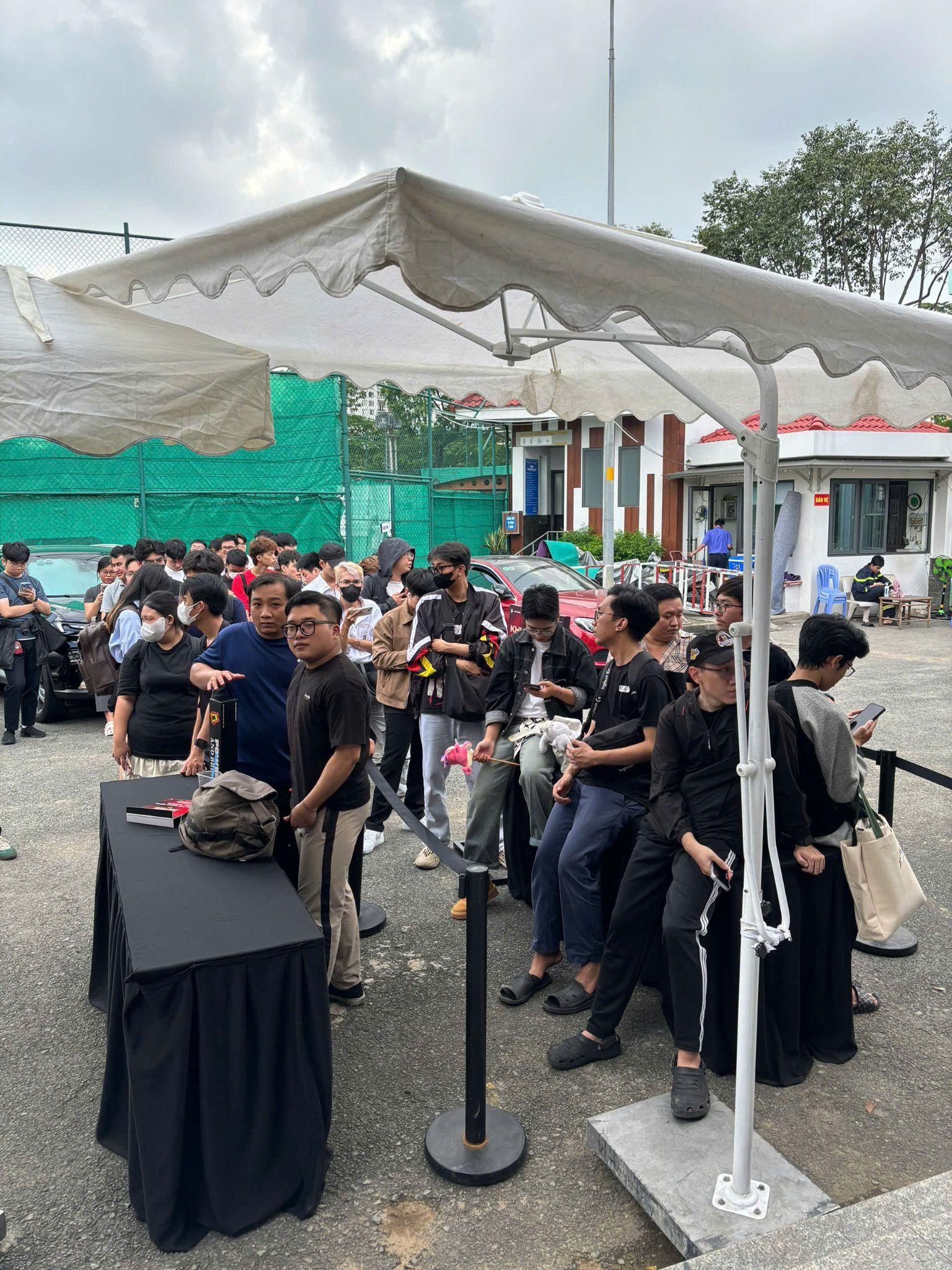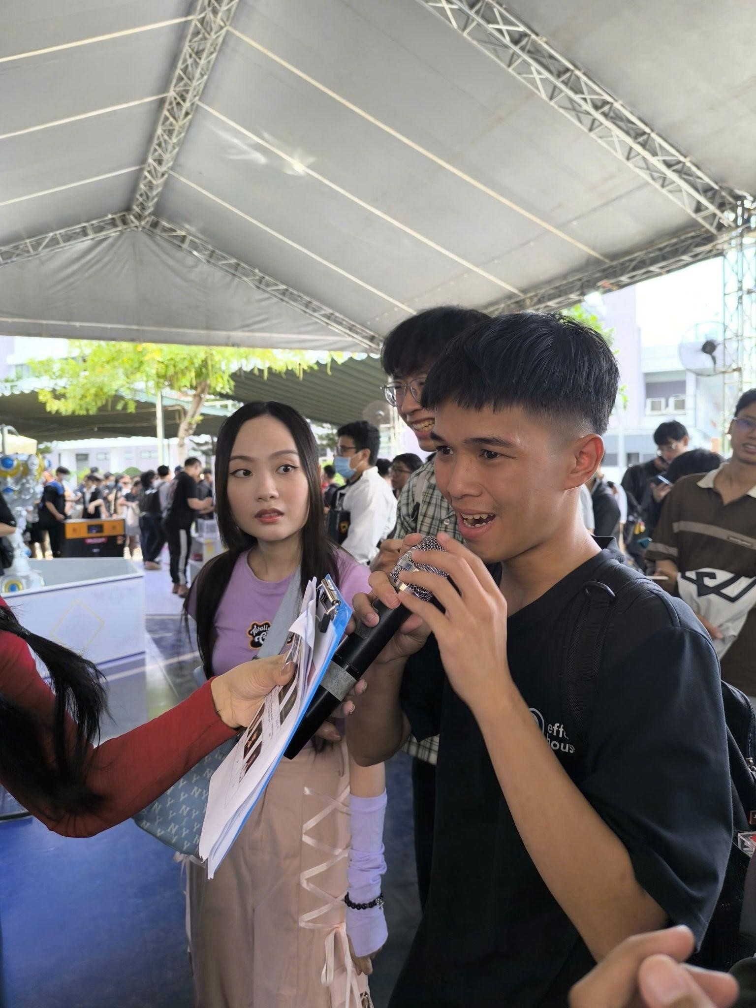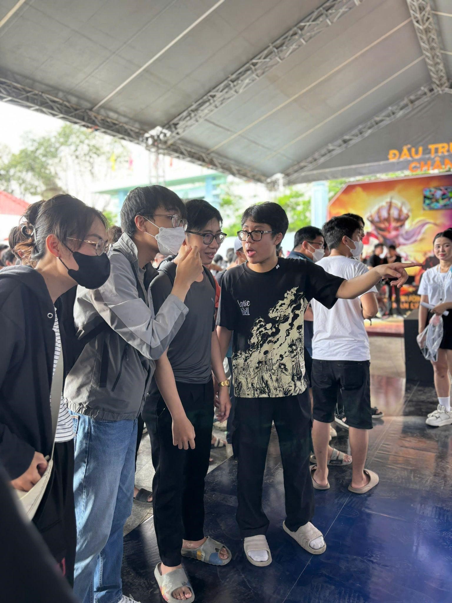 Nhóm bạn trẻ thay nhau check-in, trả lời câu hỏi từ BTC để nhận quà kỷ niệm. Anh em xếp hàng vẫn không quên bàn tán về meta mới, vừa nói vừa cười như đang trong phòng chat rank 5 người.