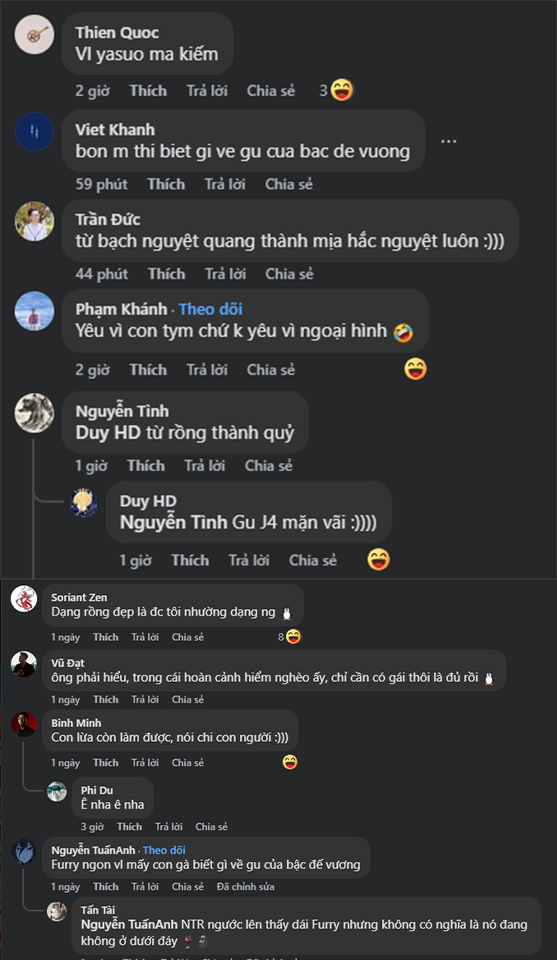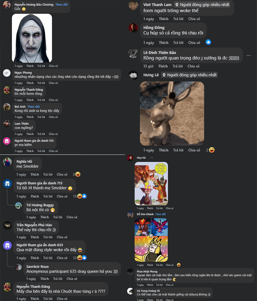 - "Từ rồng thành quỷ", "Con ngồng?", "Form người trông woke thế 😂"