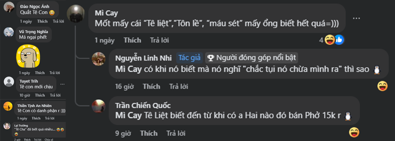 - “May để ‘Tê Con’ chứ để ‘Tê Liệt’ còn lực nữa :))” — nếu thế thật, mạng xã hội chắc “sập server”.
