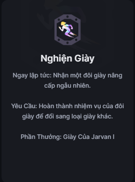 Khi chọn lõi Nghiện Giày, bạn sẽ nhận ngẫu nhiên một đôi giày nâng cấp. Nhưng phần thú vị thực sự nằm ở chuỗi nhiệm vụ đi kèm – mỗi loại giày sẽ yêu cầu bạn hoàn thành một thử thách riêng biệt. Sau khi hoàn thành, hệ thống sẽ tự động chuyển bạn sang đôi giày khác để tiếp tục hành trình.