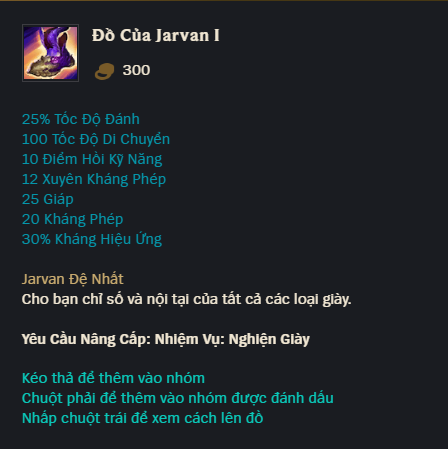 Khi hoàn thành đủ 6 nhiệm vụ tương ứng với 6 loại giày, bạn sẽ nhận được phần thưởng cực “xịn”: Giày của Jarvan I – món trang bị hợp nhất toàn bộ chỉ số và nội tại của tất cả giày trong game!