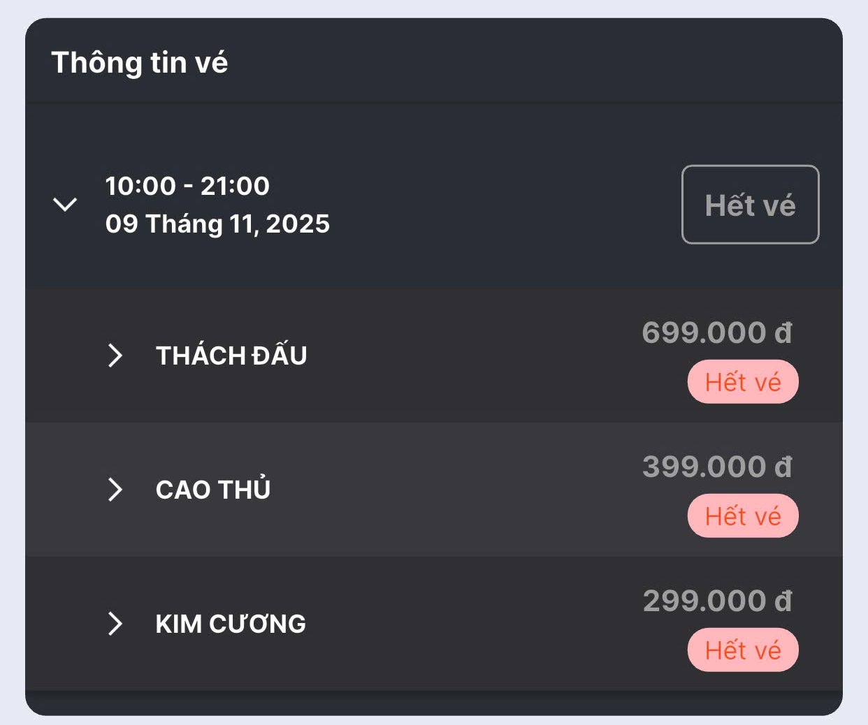 Từ vé Kim Cương (299.000đ), Cao Thủ (399.000đ) đến Thách Đấu (699.000đ), tất cả đều được “chốt đơn” trong buổi đầu tiên mở bán. Sức nóng của sân khấu Viewing Party đã vượt ngoài mong đợi, khi hàng nghìn fan LMHT khắp cả nước cùng săn tìm tấm vé quý hiếm này.