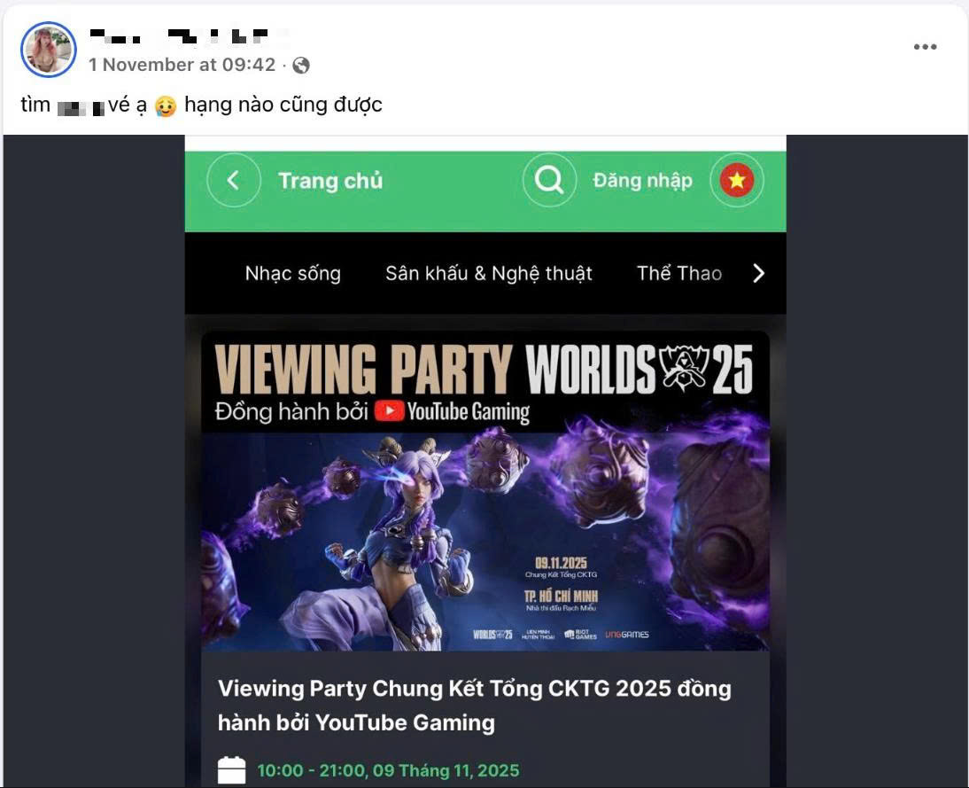 Và tất nhiên, như bao fan LMHT khác, mình cũng không thể đứng ngoài cuộc. Suốt mấy ngày vừa rồi, mình đã “cày cuốc” khắp các group Facebook, Discord với hy vọng săn được tấm vé quý giá để hòa mình vào không khí rực lửa của Chung Kết Thế Giới 2025.