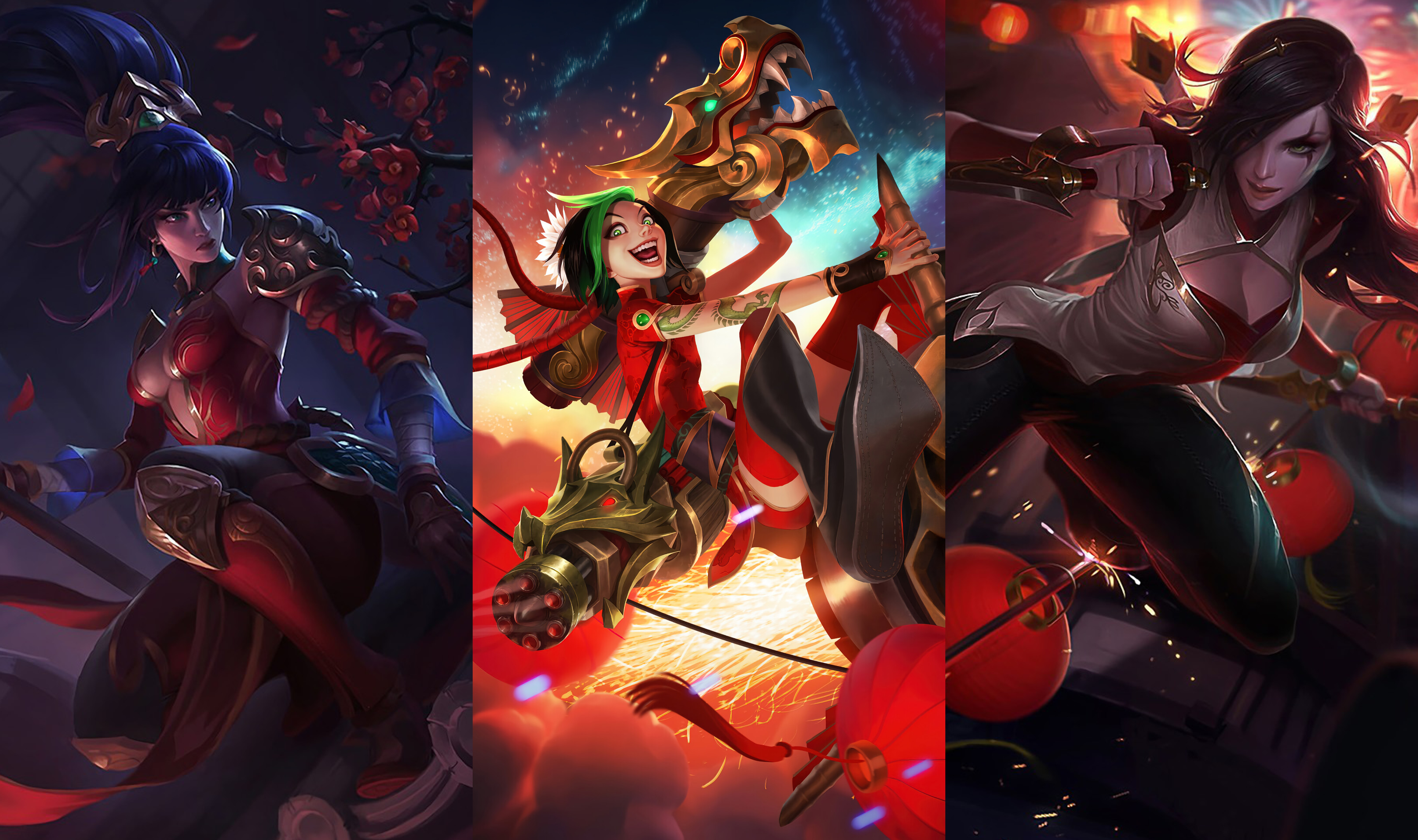 Ất Mùi 2015 mang đến sắc xuân rực rỡ và sôi động hơn bao giờ hết với Jinx Pháo Hoa, biểu tượng của lễ hội náo nhiệt, đi cùng sự lịch lãm và sắc sảo của Katarina và Nidalee Loạn Thế.