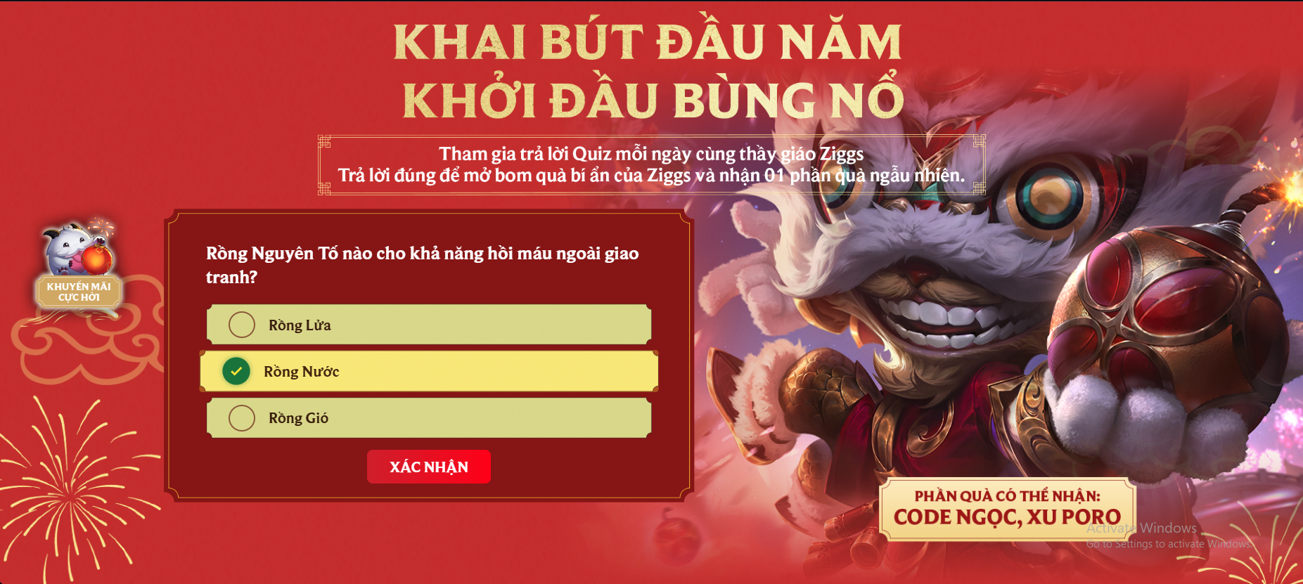 - Phần thưởng: Khi bạn trả lời đúng thầy giáo Ziggs sẽ cho bạn mở quà bom bí ẩn gồm 1 phần quà ngẫu nhiên (Code Ngọc, Xu Poro).