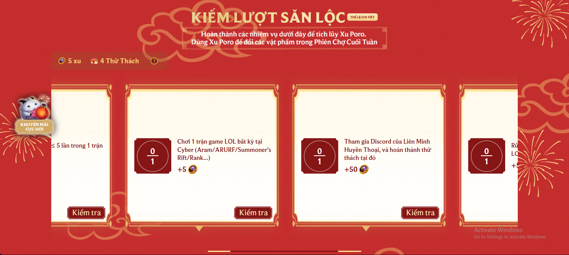 Sau khi hoàn thành trong game, bạn phải quay lại đây và nhấn "Kiểm Tra" để nhập code hoặc nhận xu poro (tuỳ thử thách).