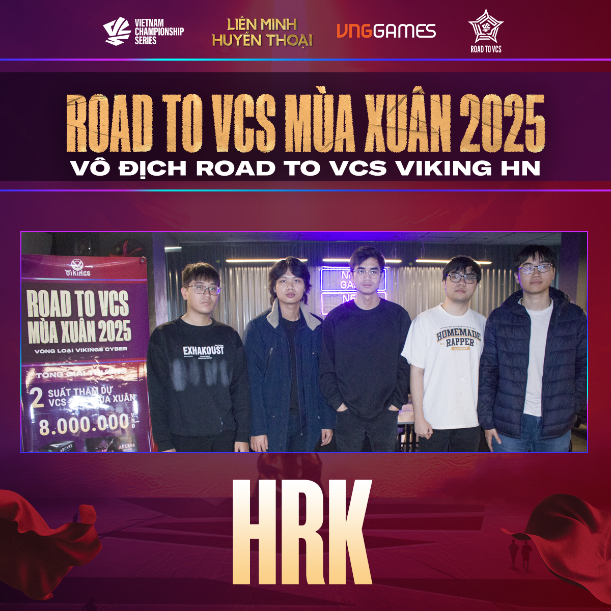 - Hanoi Rookies Esports (HRK) - Nhà Vô Địch Road to VCS Vikings Hà Nội: HRK đã thể hiện sự trưởng thành vượt bậc trong suốt giải đấu, với khả năng phối hợp đồng đội ăn ý và những quyết định táo bạo trong giai đoạn cuối trận.