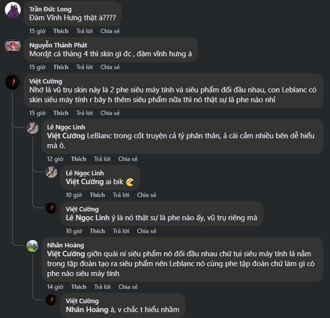 - Cốt truyện chồng chéo: Một số fan tinh ý nhận ra rằng LeBlanc vốn đã có skin thuộc vũ trụ Siêu Máy Tính, nay lại được đồn đoán gia nhập SIÊU PHẨM, khiến nhiều người đặt câu hỏi rằng “cuối cùng cô ấy thuộc phe nào?”