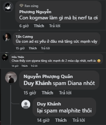 Một người chơi còn hài hước bình luận: “Ủa con ad ez yếu ở đâu mà tăng sức mạnh vậy? Kog'Maw có làm gì đâu mà nerf ta ơi!".
