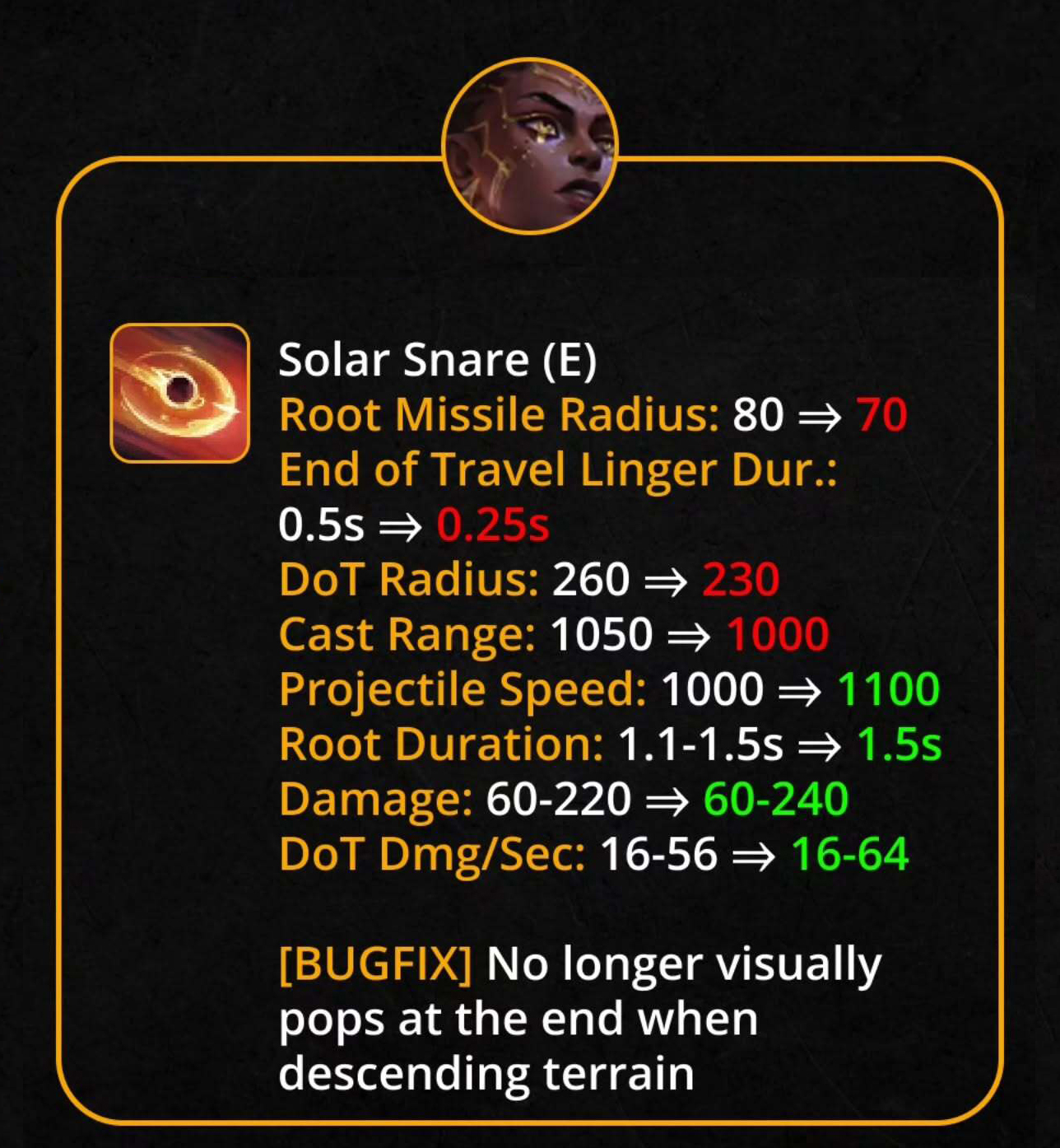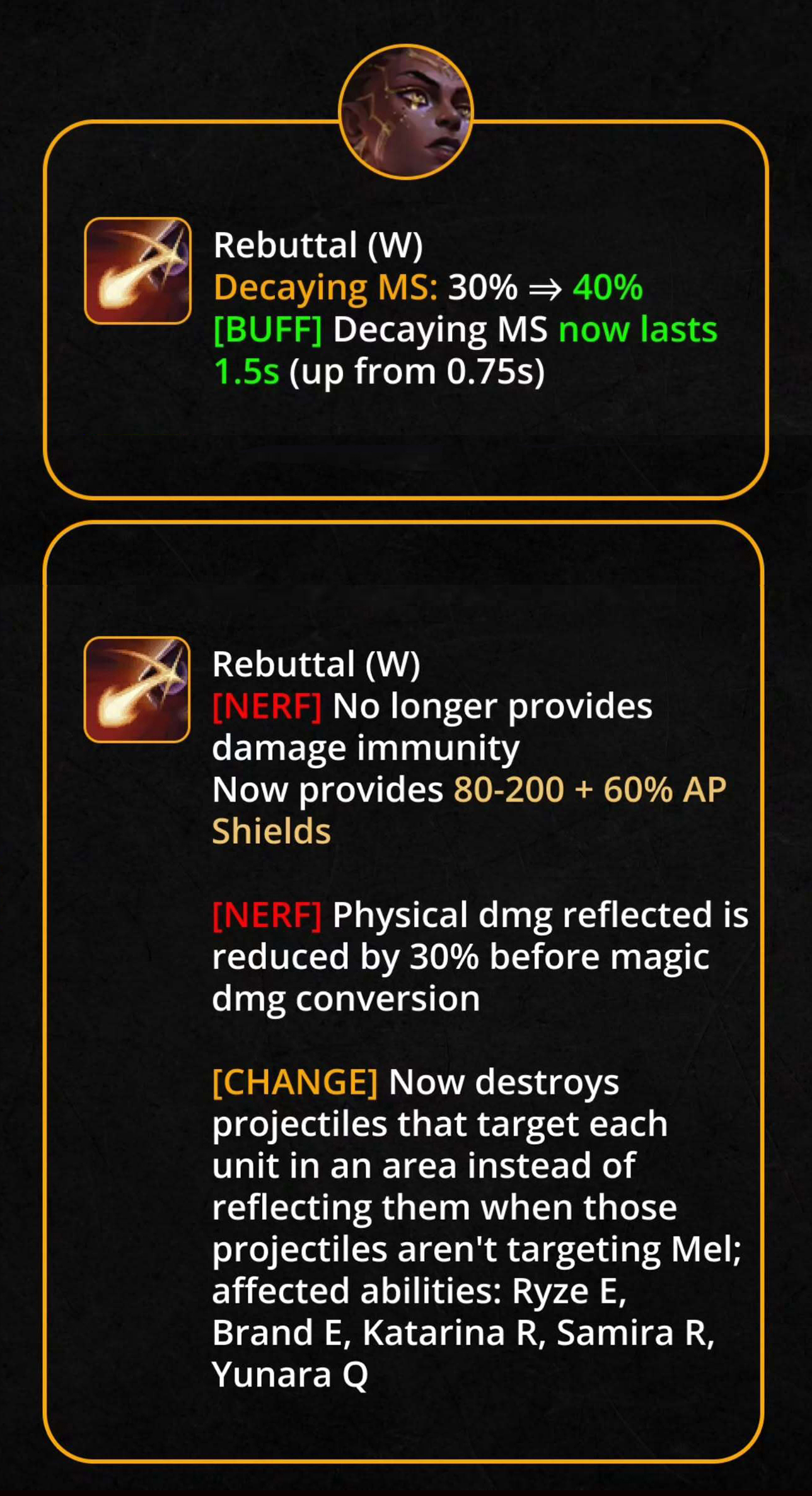 Thay đổi cơ chế: chuyển sang sát thương theo thời gian (DoT), khiến Mel khó tận dụng bảng ngọc Thiên Thạch Bí Ẩn như trước.