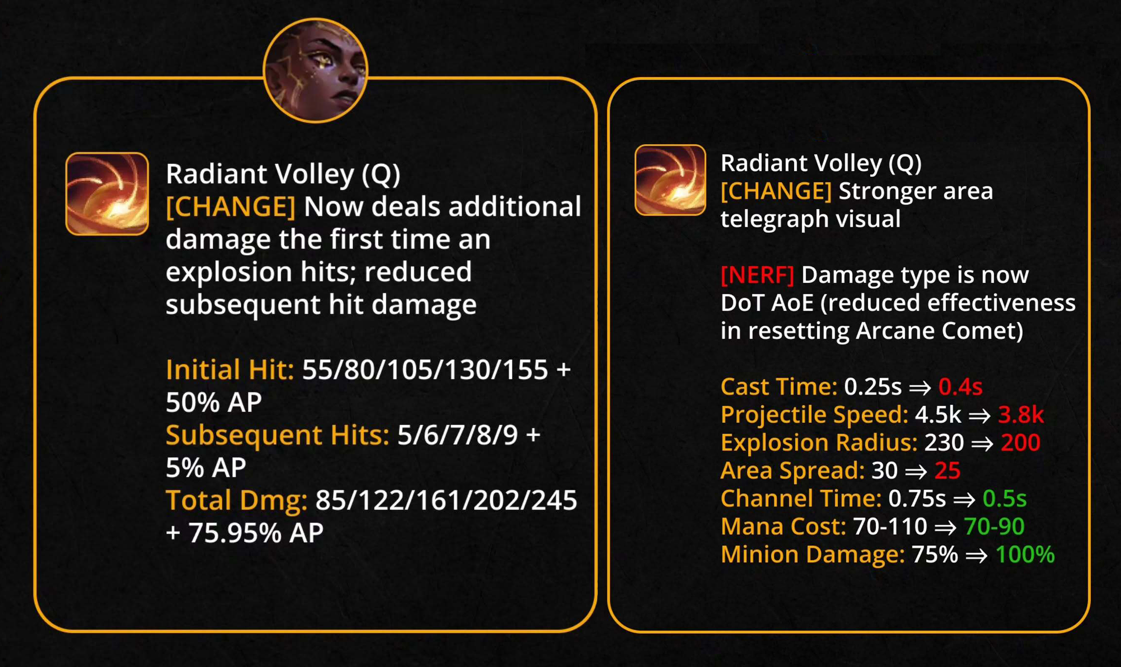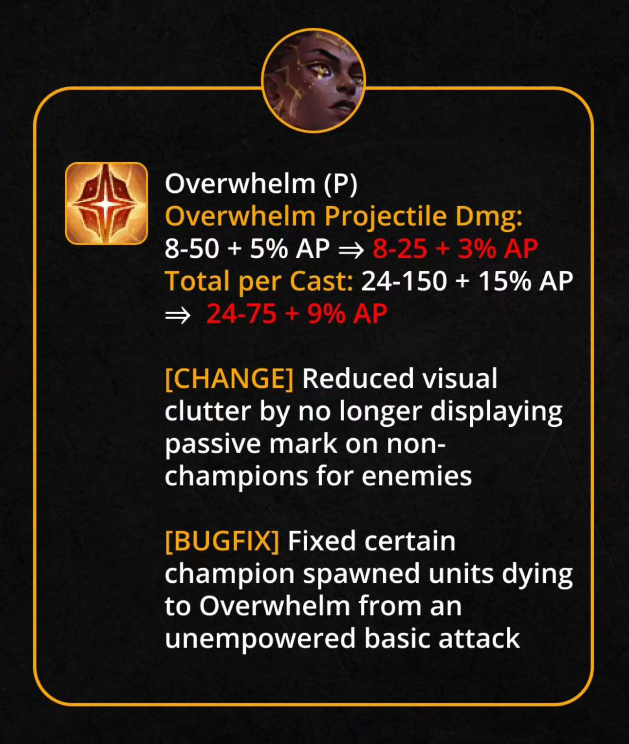 Tổng sát thương: giảm mạnh 24–150 (+15% AP) → 24–75 (+9% AP).