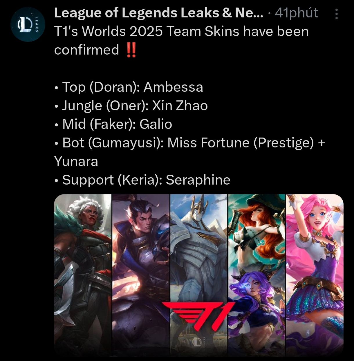Sau một thời gian dài xuất hiện hàng loạt tin đồn và các nguồn “leak” chưa được xác thực, thông tin mới nhất từ các nguồn uy tín cho thấy dàn trang phục vinh danh nhà vô địch thế giới 2025 của T1 đã chính thức được xác nhận.