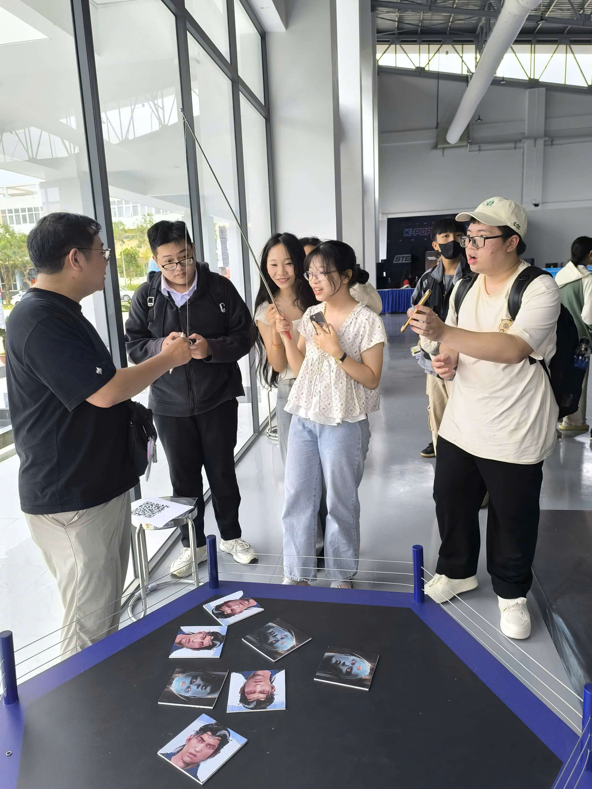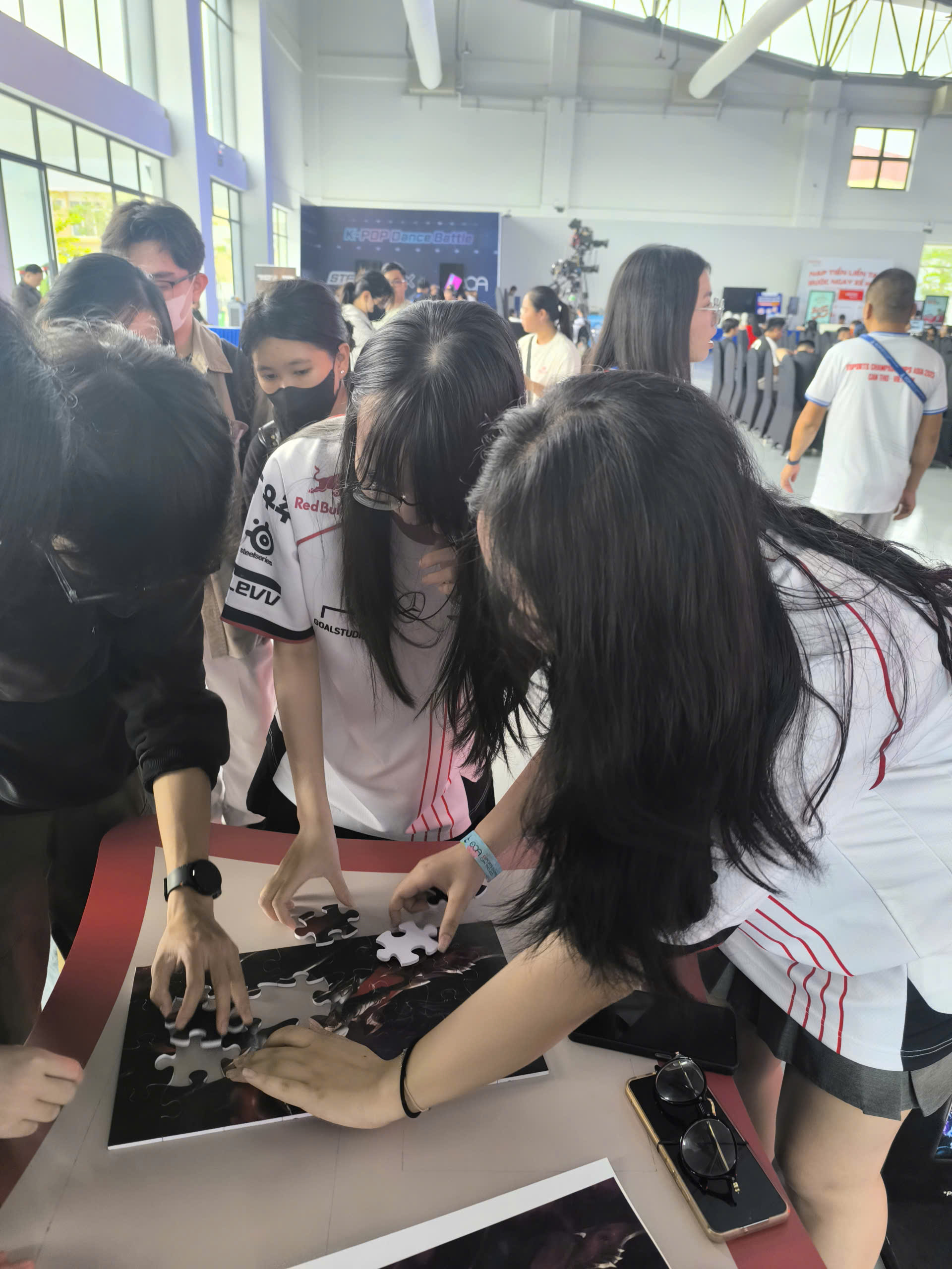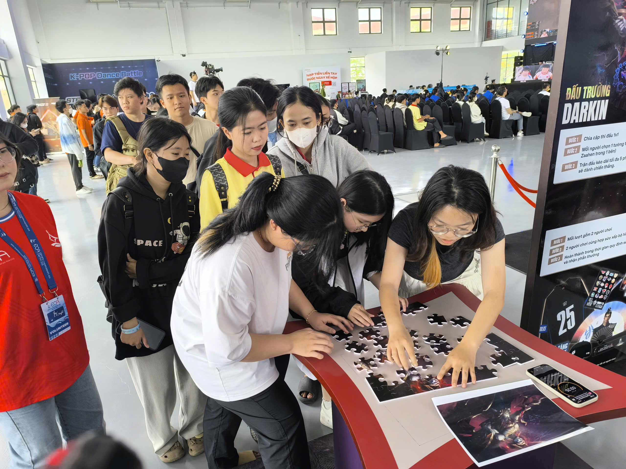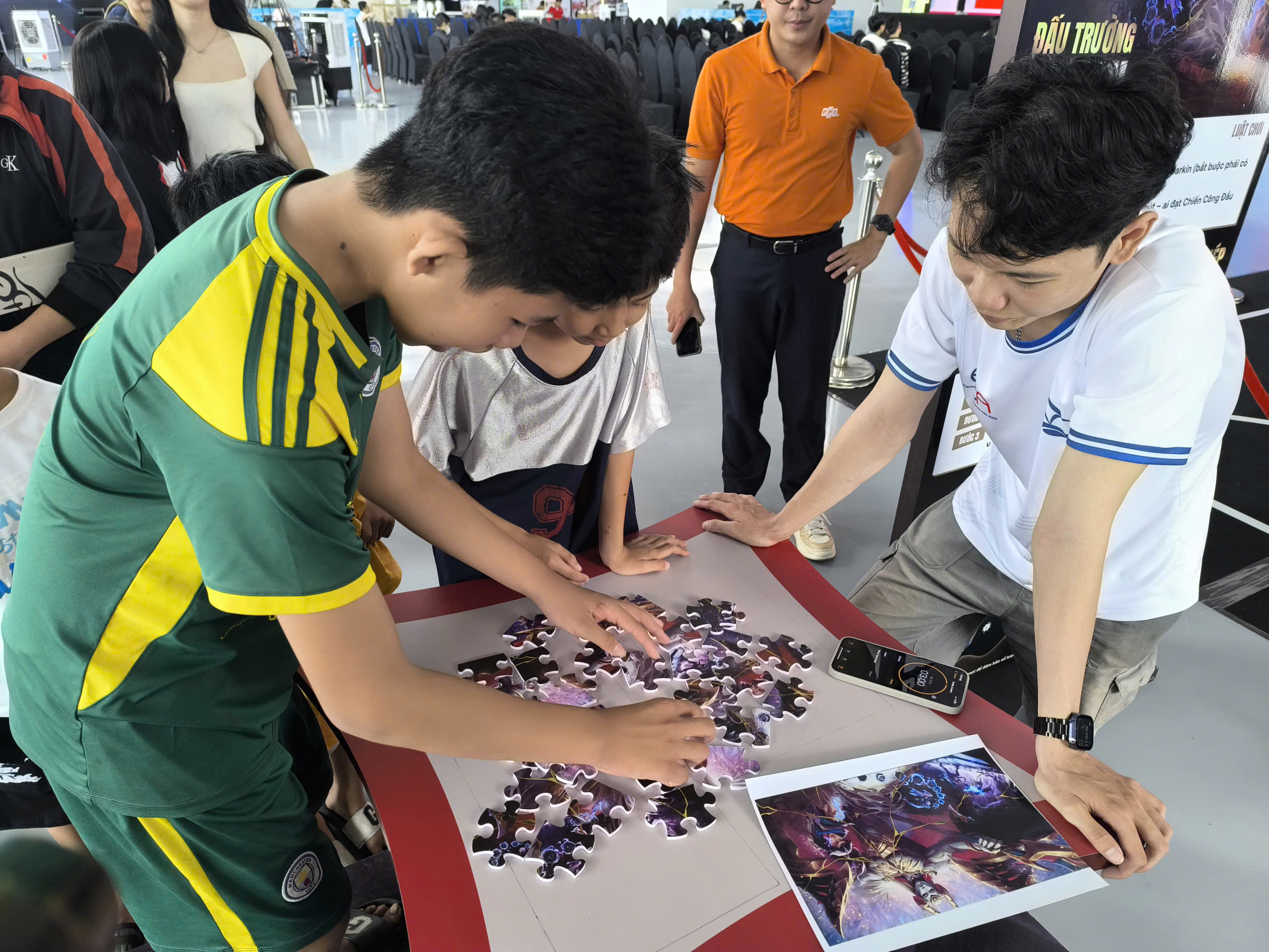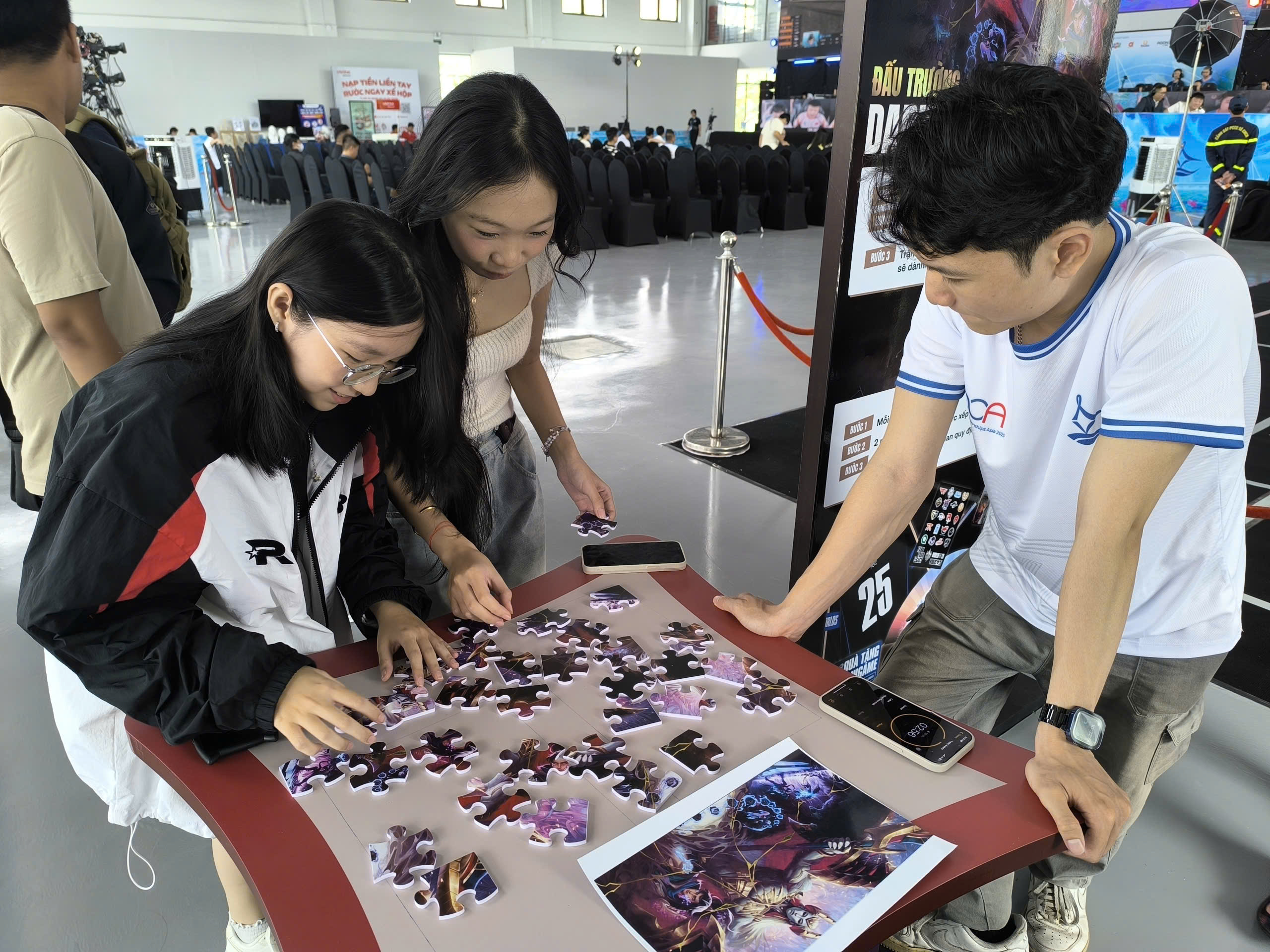 Không khí trở nên căng thẳng khi các bạn trẻ cúi sát bàn, xoay từng mảnh ghép để hoàn thiện hình Bất Diệt Thần Quân. Nhiều bạn nữ tham gia vô cùng nhanh nhẹn và tập trung, khiến người xem liên tục trầm trồ. Ai hoàn thành nhanh nhất sẽ nhận quà ngay tại chỗ.