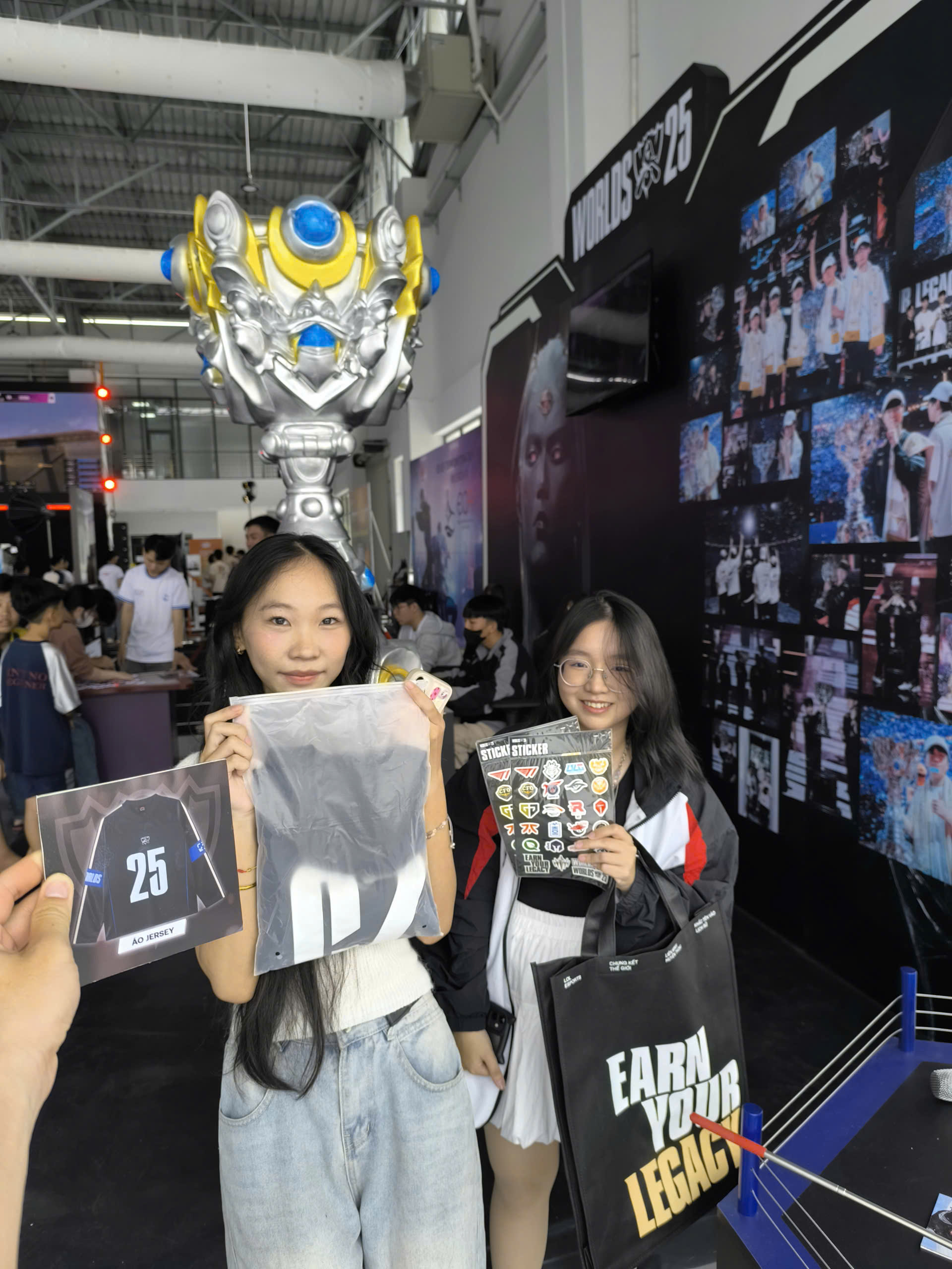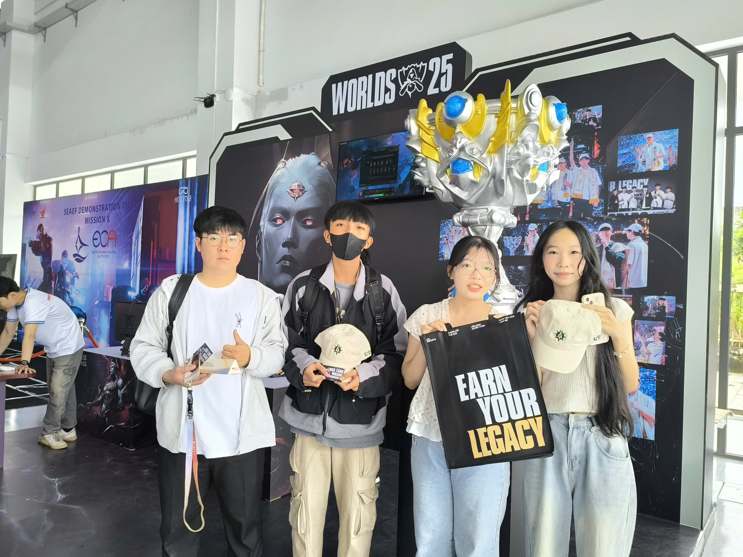 Tiếng cười, tiếng hò reo và những câu gọi “anh ơi, em trúng rồi!” vang khắp khu vực, khiến booth LMHT lúc nào cũng đông vui và náo nhiệt. Người chơi vừa giao lưu, vừa thử sức ở các minigame và khoe những phần quà cực xịn như áo LMHT phiên bản đặc biệt, sticker đội tuyển, túi tote “EARN YOUR LEGACY”, poster, code độc quyền và nhiều quà tặng hấp dẫn khác. Không khí rộn ràng ấy giúp booth trở thành điểm dừng chân không thể bỏ lỡ suốt cả ngày sự kiện.