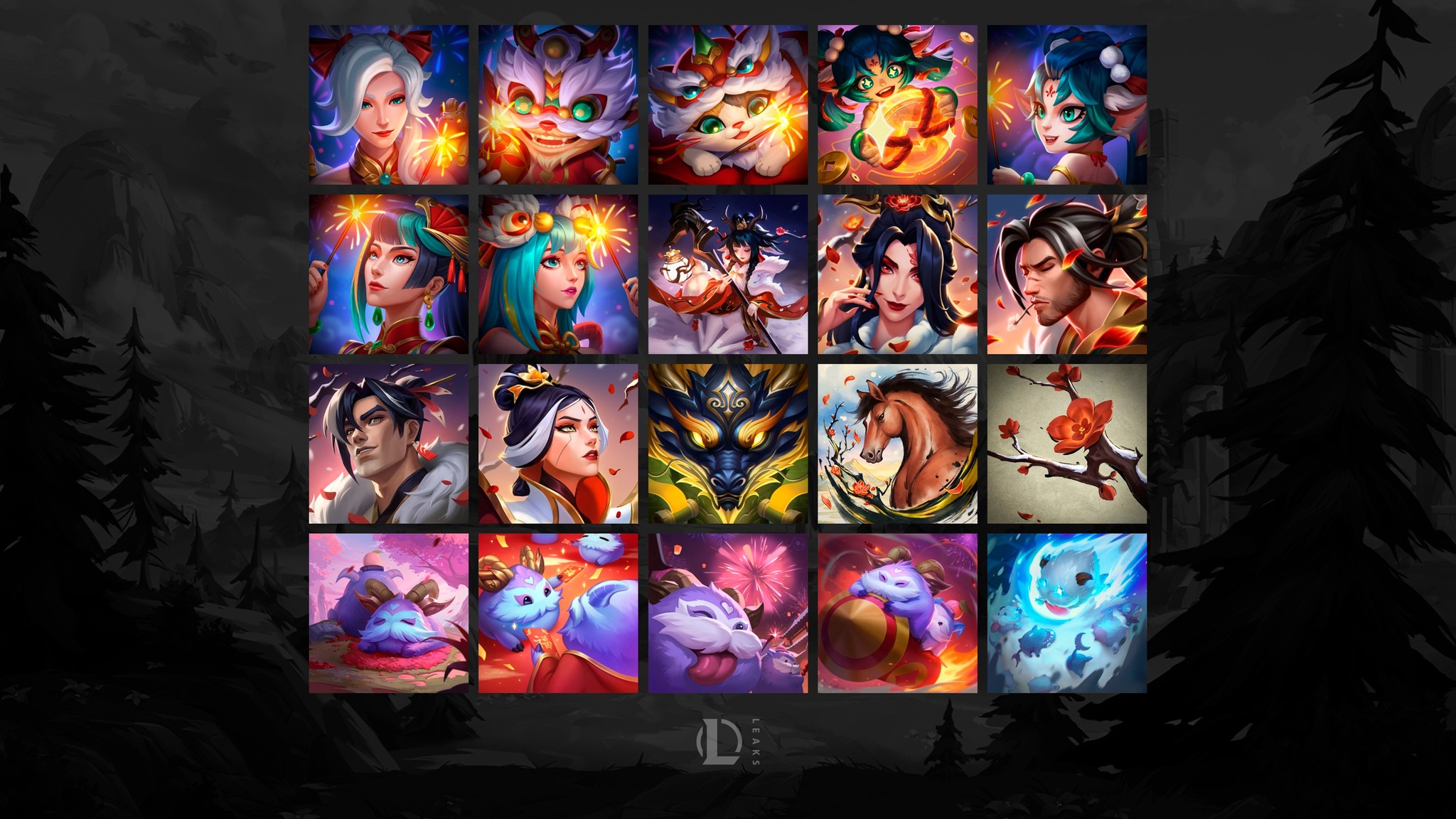 Biểu tượng: Lấy cảm hứng từ phong cách chân dung Tết, các icon khắc họa hình ảnh Poro đáng yêu, ngựa thần, rồng thiêng cùng những vị tướng nổi bật. Bảng màu tươi sáng, kết hợp khung viền vàng sang trọng, giúp trang hồ sơ người chơi trở nên rực rỡ và nổi bật hơn bao giờ hết.