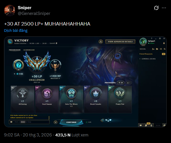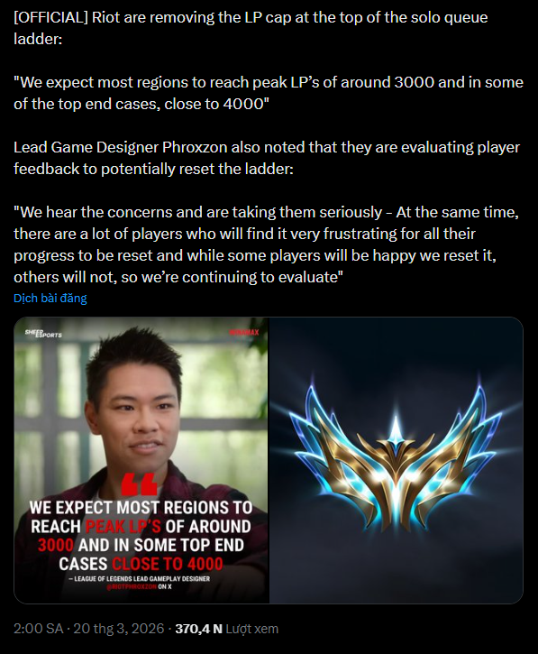 Thực tế đã nhanh chóng chứng minh điều này khi Sniper (Top 1 Thách Đấu Bắc Mỹ) ghi nhận +30 LP ngay cả khi đã vượt mốc 2500 LP, một điều gần như không thể xảy ra trong quá khứ. Tương tự, nhiều tuyển thủ top đầu khác cũng xác nhận việc “leo rank không giới hạn” khiến không khí cạnh tranh vì thế trở nên khốc liệt và sôi động hơn bao giờ hết.