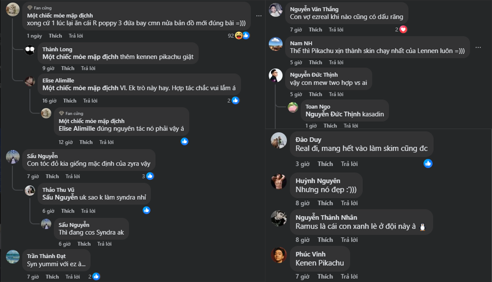 Sau khi loạt fanart LMHT x Pokémon được chia sẻ rộng rãi, hàng nghìn bình luận đã xuất hiện bày tỏ mong muốn Riot Games bắt tay Nintendo cho ra đời màn collab “thế kỷ”. Không ít game thủ còn hài hước tuyên bố sẵn sàng chi tiền nếu các tạo hình này trở thành skin chính thức trong game: