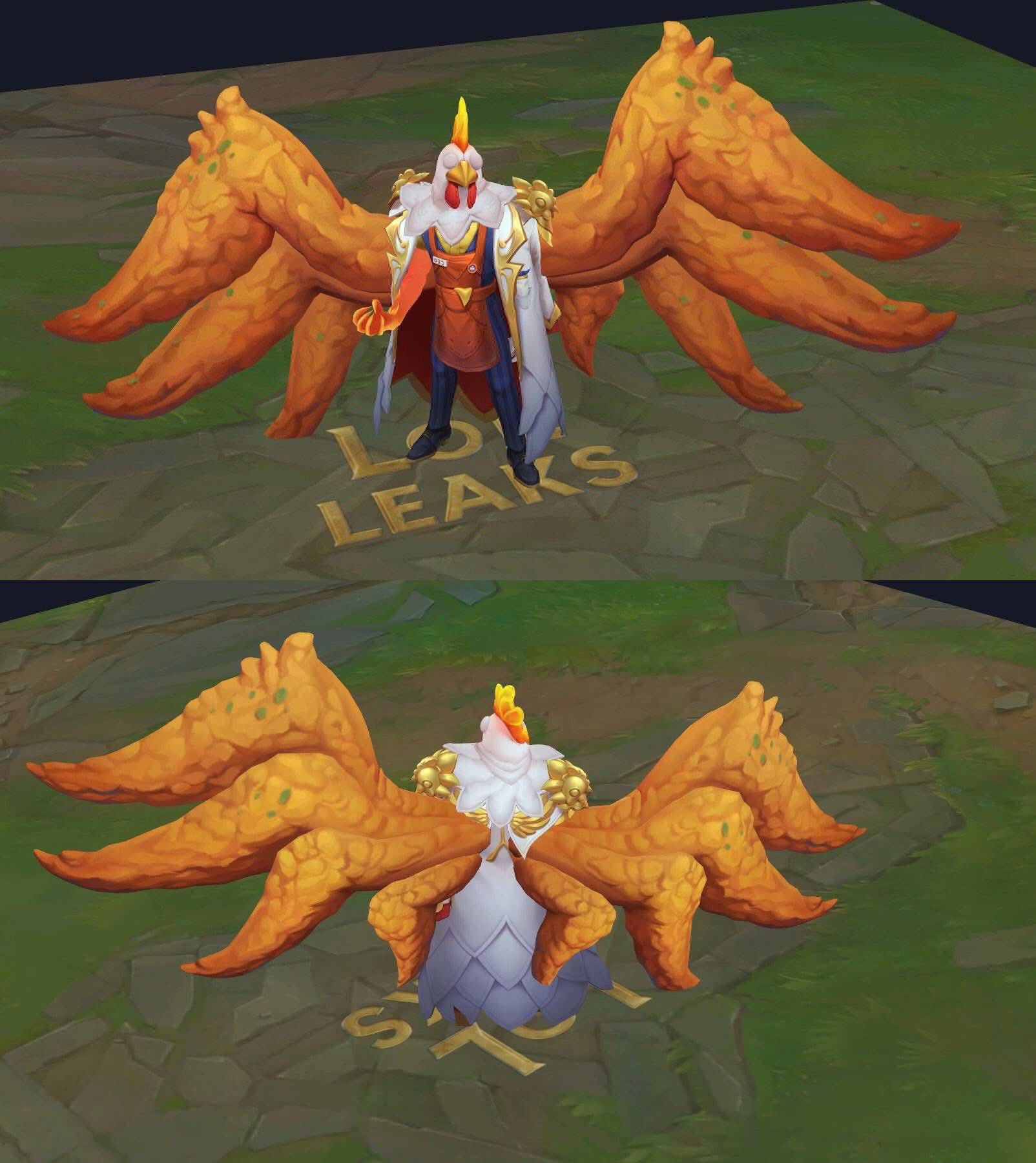 Cánh gà khổng lồ: Điểm nhấn nằm ở kỹ năng R (Hóa Quỷ). Thay vì đôi cánh quạ đen ngầu lòi, Swain giờ sở hữu hai chiếc cánh gà chiên xù khổng lồ, vừa hài hước vừa “ngon mắt”.